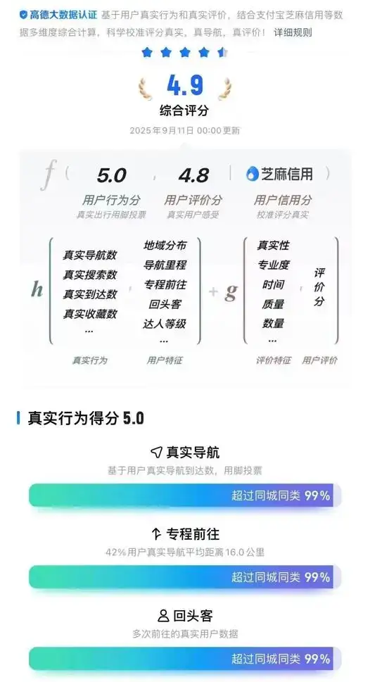 根据扫街榜所披露的评分细则,店铺综合评分由“真实行为得分”和“评价得分”组成,并且和用户本身的信用度绑定(如与支付宝芝麻信用体系的打通),前者基于用户的导航到店次数、复购率、是否专程前往等行为数据,后者基于消费后的评价数据等来衡量。