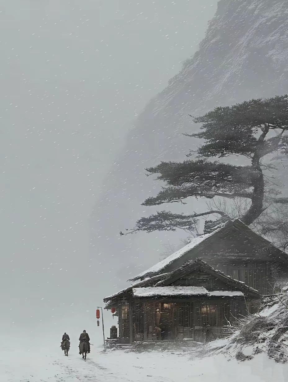 如果穿越到了这个场景,我定会牵马走向那盏红灯笼。轻叩门扉,讨一盏热茶,听屋主讲讲这山中岁月。再踏着吱呀作响的木阶,倚窗看雪落松枝,听风撞门环。与旅人共赏这清冷中的暖光,让漂泊的心,在这一方天地寻得片刻安宁,岂不快哉?如果你穿越到了这个场景,你最想做的事是什么?