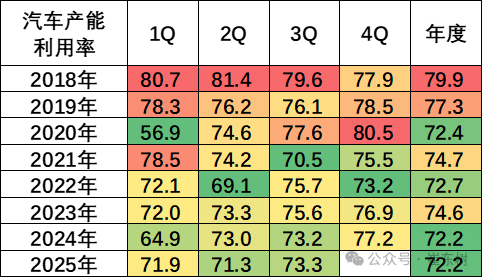 2025年三季度,全国规模以上工业产能利用率为74.6%,比二季度上升0.6个百分点,比上年同期下降0.5个百分点。分主要行业看,2025年三季度,汽车制造业为73.3%;2025年1-9月汽车行业产能利用率72.2%,相对处于较低水平。