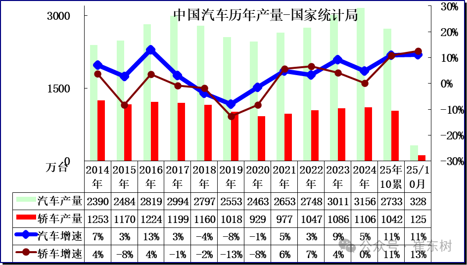 2025年1-10月汽车生产2733万台,同比增11%;新能源汽车生产1267万台,同比增28%,渗透率46%;燃油车生产1465万台,同比持平。