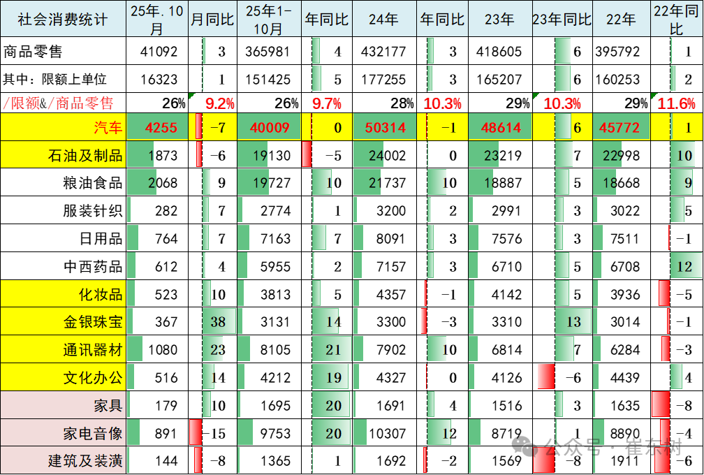 2025年10月份,汽车消费同比降7%;1—10月份,汽车消费额同比降0.2%。10月的中秋节月度错位和高基数压力体现,因此虽然市场不错,但增长不明显。