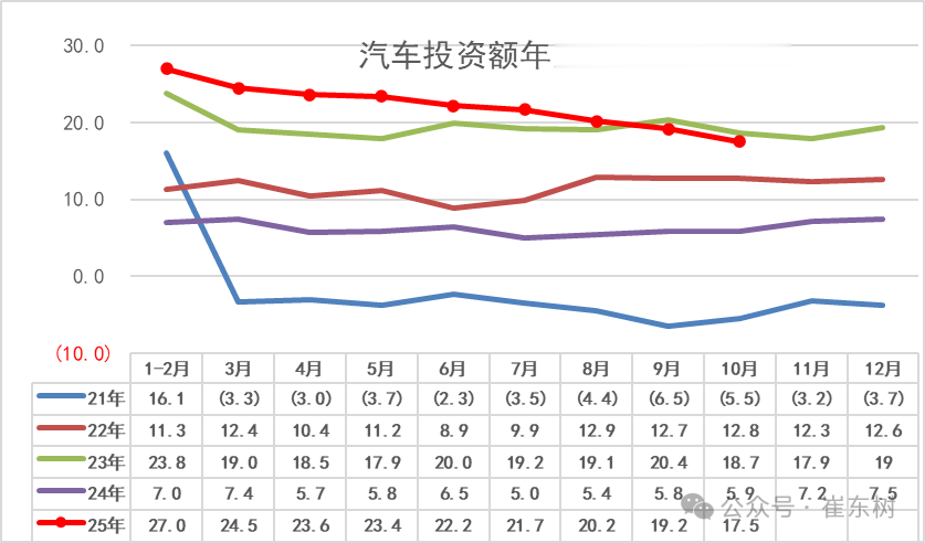 2025年1—10月份,全国固定资产投资(不含农户)408914亿元,同比下降1.7%。2025年汽车投资增速也达到17.5%,近两年汽车投资超预期的强,处于近年的1-10月历史高位,也远高于其它制造业行业的投资增速。
