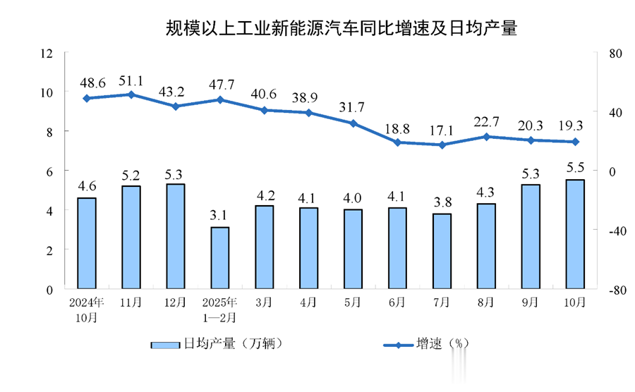 2025年10月份日均新能源汽车生产5.5万台,同比增19.3%。由于新能源轿车的去年基数不高,今年生产波动较大。今年1-10月的生产较好是小微型电动车,需求也是中低端的需求较强,因此销售额增速稍低于销量增速。