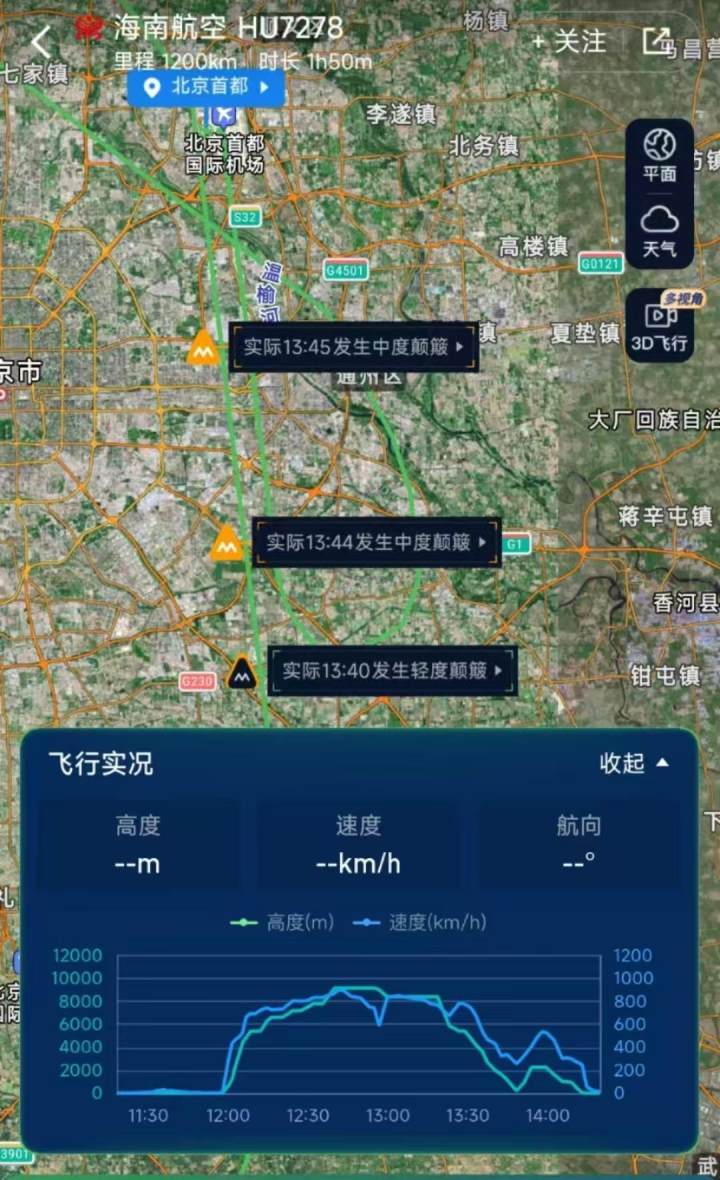 据“航旅纵横”显示,飞机在飞行中出现多次轻度、中度颠簸情况。据飞行实况图,飞机在降落过程中出现高度再次抬升的情况。据北京气象部门16日早晨发布的信息,16日白天阵风可达七级至八级,9时15分,北京气象台升级发布大风黄色预警信号。