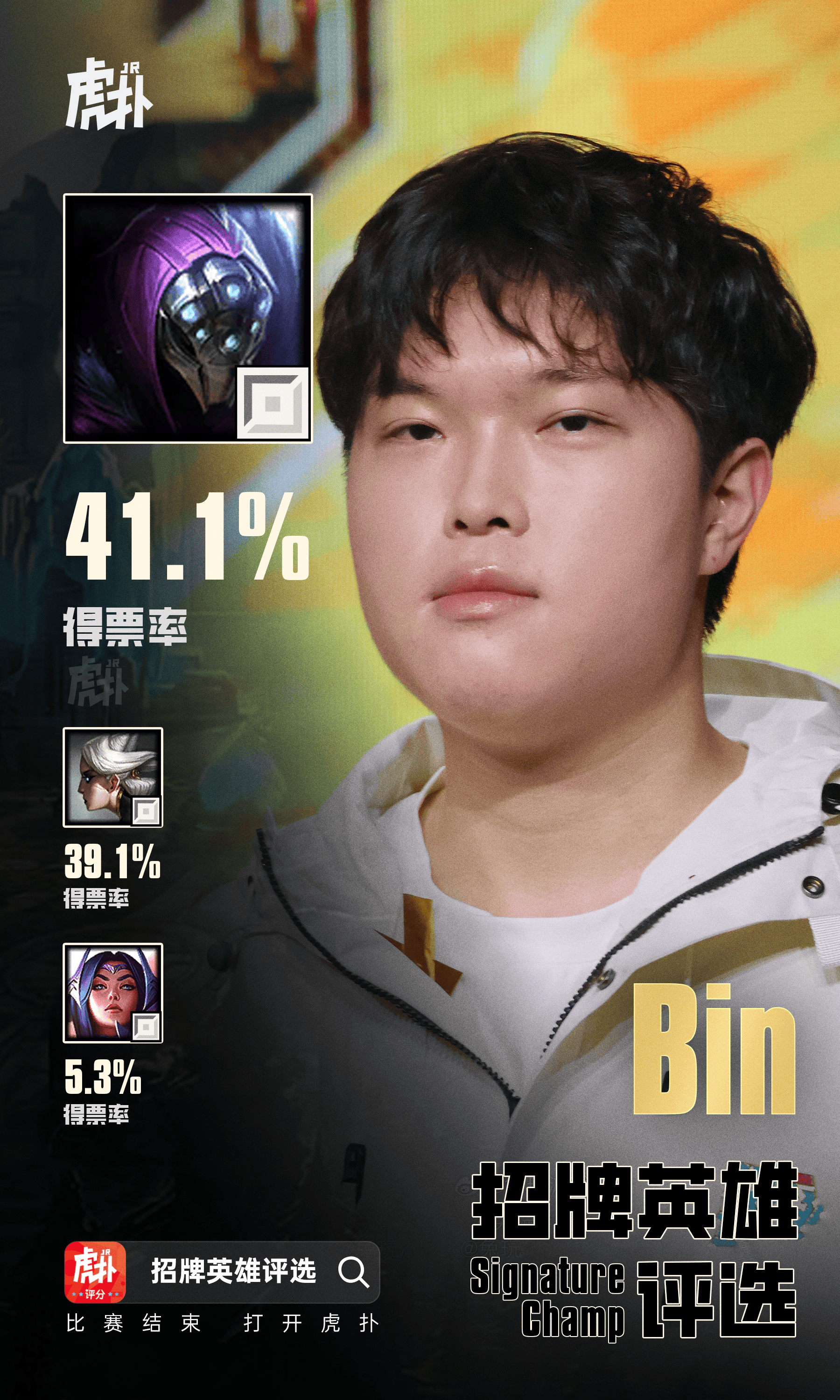 虎扑11月17日讯经过JRs昨日的评选,武器以41.1%得票率当选Bin招牌英雄。