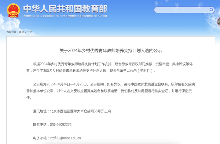 近日,教育部公布2024年乡村优秀青年教师培养支持计划公示名单,经省级教育行政部门推荐、资格审查、集中评议等环节,产生了300名乡村优秀青年教师培养支持计划人选。其中,浙江5人拟入选。