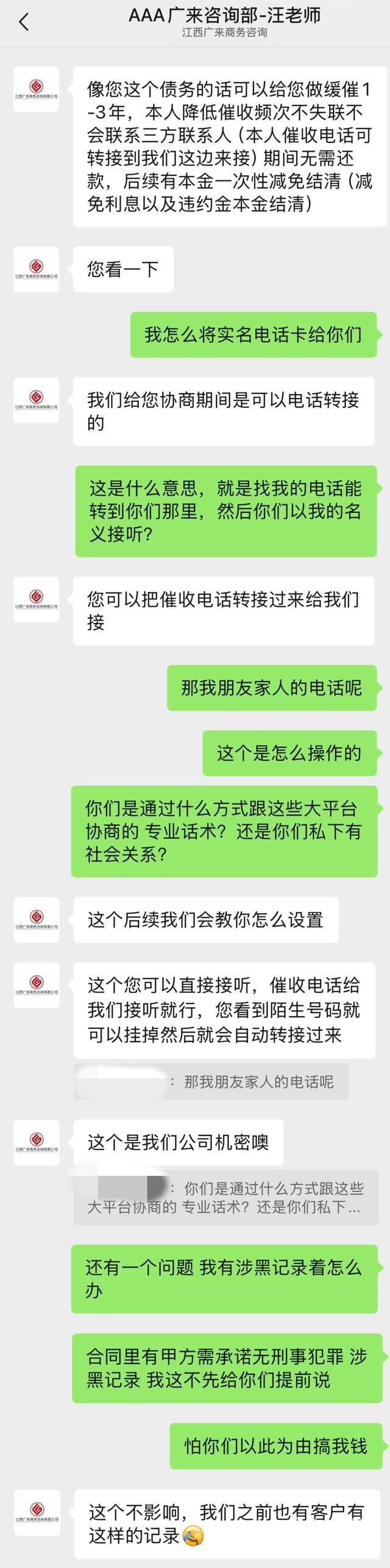 根据穆先生提供的线索,信号新闻记者以“债务缠身、难忍催收”为由添加了“美女”网友推荐人的微信。同样的剧情如约而至:同样是微信头像和温柔语音证明“美女”人设,之后又是看上去很像复制粘贴来的故事——欠钱陷入困境,找广来商务“汪老师”帮忙解决问题,协商减免全部利息,争取1到3年的延期还款……“四万多的欠款才花了一千多元就搞定了。”