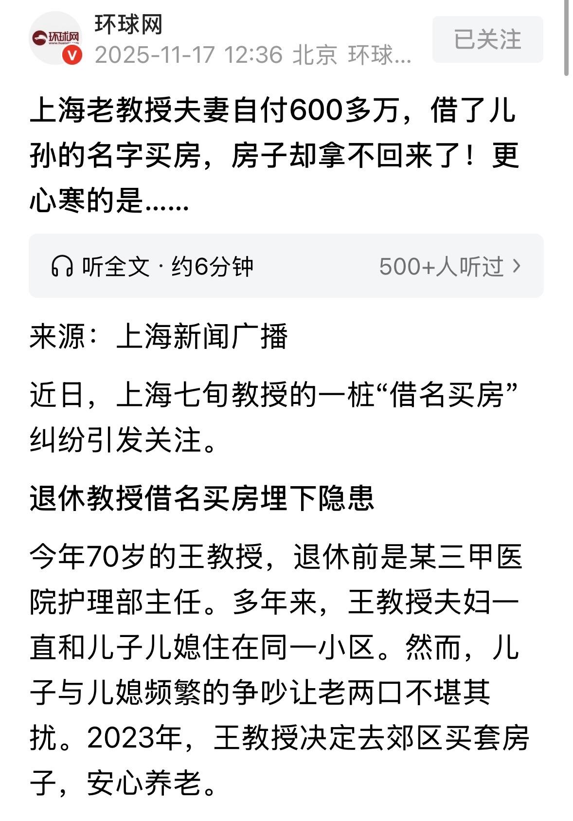 上海,7旬老人名下已有3套房,不再具备买房资格,他想以儿子的名义再买一套,儿子开出条件,让把孙女的名字也加上,老人同意了,花600多万拿下新房,接着把手里2套旧房卖掉了,此时老人重新获得了购房资格,就去办理产权变更,把新房重登回自己名下,过户时,工作人员说需要孙女的监护人,也就是儿媳签字,万万没想到,儿媳拒绝签字,还跟老人儿子提离婚,老人一纸诉状把一家三口告上法庭,结局太意外。 王教授今年70岁,退休前是三甲医院的护理部主任。 退休后,老两口原本图个省心,跟儿子儿媳住同一个小区。谁料,小两口隔三差五就要吵一回架,摔门砸碗的声音日日钻耳。 老两口这个岁数了,就图个清净,根本经不住这么闹腾,2023年,王教授动了念头,想去远郊买套房,躲开这闹心的地方。 然而,他一查政策犯了难,他名下已经有三套房,没资格再买一套了。 于是,王教授就找儿子商量,说用你的名字买吧,我们住。 儿子沉吟半晌点头应了,却额外提了个条件,那就是房子得把小孙女名字也加上,这样他老婆心里也开心。 想着是自家骨肉,孙女的份额将来终究也是孩子的,王教授没犹豫,应承了下来。 2025年元旦,老两口终于搬进新居,然而,就在他们以为能踏实过日子的时候,家里却因为房子的事爆发矛盾,一家人还因此闹上法院。 原来,买完期房别墅后,老两口陆续出售了名下2套旧宅,重新获得了购房资格。 恰在此时,新房终于能办产权证了。王教授找到儿子,提醒他应该按照当初的约定,把房子的产权变更回到自己名下了。 儿子倒没推拒,爷俩还去了公证处,签下了一份《借名买房协议》。 本以为尘埃落定,岂料临到过户关口,房产交易中心说,小孙女未成年,需要监护人代签字。 而这位监护人,正是王教授的儿媳,可他万万没想到,儿媳竟断然拒绝签字, 王教授这下傻眼了,当初说好的借名买房,儿媳还真把房子当成她自己的了? 2025年4月,眼看房子迟迟要不回来,王教授一纸诉状递进法院,将儿子、儿媳、小孙女一并告上法庭,只为讨回那本该属于自己的栖身之所。 一审法庭认定的关键,竟是王教授与大孙女一段寻常的家常微信聊天记录。 记录里,王教授曾随口提到说:奉贤这房子啊,我们住个15年、20年,之后留给你爸和你妹…… 法官据此一锤定音,认为这就是王教授把房产“赠与”儿孙的铁证。 判决书下来,老两口相对无言,只有满腹苦涩。更让王教授如鲠在喉的是,法院竟将此房断为他的“个人财产”,老伴的权益被彻底忽略,甚至未被追加为原告参与诉讼。 因为这纸判决,王教授老伴多年的委屈也彻底爆发了,她激烈质问王教授,甚至抛出了“离婚”两个字。 与此同时,争吵多年的儿子与儿媳,离婚官司也打响了。 更让人想不到的是,老两口从小疼爱的大孙女竟在法庭上直指奶奶“索要房产”,他俩不猜都知道,这一定是大人教的。 王教授上诉到中院。二审法官数次调解,抛出一个方案:房子产权,王教授夫妇与小孙女,各占一半。 对此,老两口坚决摇头。 不过最后,心力交瘁的王教授夫妇还是忍痛退让,同意给小孙女5%的份额,并承诺:只要孩子将来懂事孝顺,养老送终,爷爷奶奶百年之后,必会留下可继承的财产给她。 然而,这带着体温的让步,依旧未能等到儿媳的点头。调解桌陷入一片沉默的僵局。 有人说了,爹妈应该想现在房价不景气,卖2套留现金给儿子,自己再买套郊区不想心烦,市区还有一套给儿子一家住。儿子不太想离,儿媳做局想好好过新房就把女儿名字写上,儿子看这情况也高兴就同意了,房子一到手媳妇不肯了,必离的决心,这下卡住了,这儿媳离完就要分财产跑路!被作局了! 面临巨额财产纠纷的时候,亲情真的经不住考验,人性是个伪命题,老年人如果把自己未来全部赌在人性或亲情之上,极大概率就是一条绝路! 那么,从法律角度,怎么看待这件事? 《民法典》第658条规定:赠与人在赠与财产的权利转移之前可以撤销赠与。 王教授与儿子签订《借名买房协议》并约定房屋产权归属,但后续因小孙女加名、儿媳拒绝签字导致过户受阻,法院一审将微信聊天记录中“住15-20年后留给儿孙”的表述认定为赠与意图,进而判定房产已构成事实赠与。 根据法条,如果赠与财产,即房屋产权未完成权利转移,如未办理过户登记,赠与人仍享有任意撤销权。 但案例中,房屋虽未完成最终过户至王教授名下的手续,但初始登记已通过借名方式完成,且涉及未成年人加名等复杂因素,导致权利状态模糊。 法院通过微信聊天记录这一直接证据,认定赠与行为已完成“权利转移”的实质要件,即赠与人通过言语明确表达赠与意图并配合完成部分登记行为,因此剥夺了王教授的任意撤销权。 对此,你怎么看? 关注@运良说法. 学法律知识不迷路