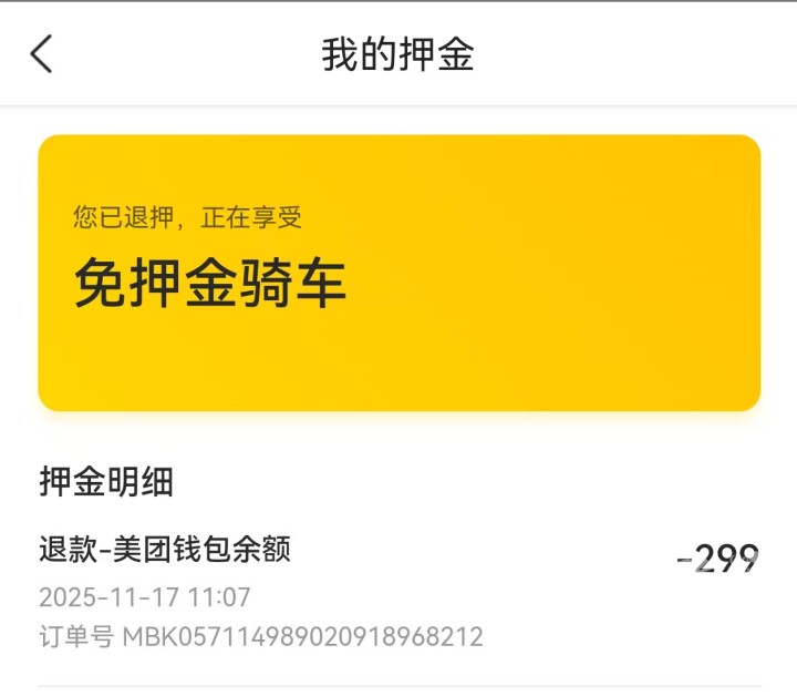 “可能还有其他的美团用户会遇到我这样的情况,可以按照美团骑行提醒我的方式去自查下:打开美团APP——搜索‘骑行’——点击右上角‘小人图标’——点击右上角‘齿轮图标’——进入设置页面——首行‘押金’栏:如显示‘免押金’字样就是没有押金,如果显示‘数字’就是有押金未退,进入点击‘退押金’,会秒退到账,退款成功后也会显示‘免押金’。我的299元押金今天11点07分已退款成功了。我2017年4月18日支付给OFO共享单车押金至今未退,OFO的APP下架了,应该是没得退了。”