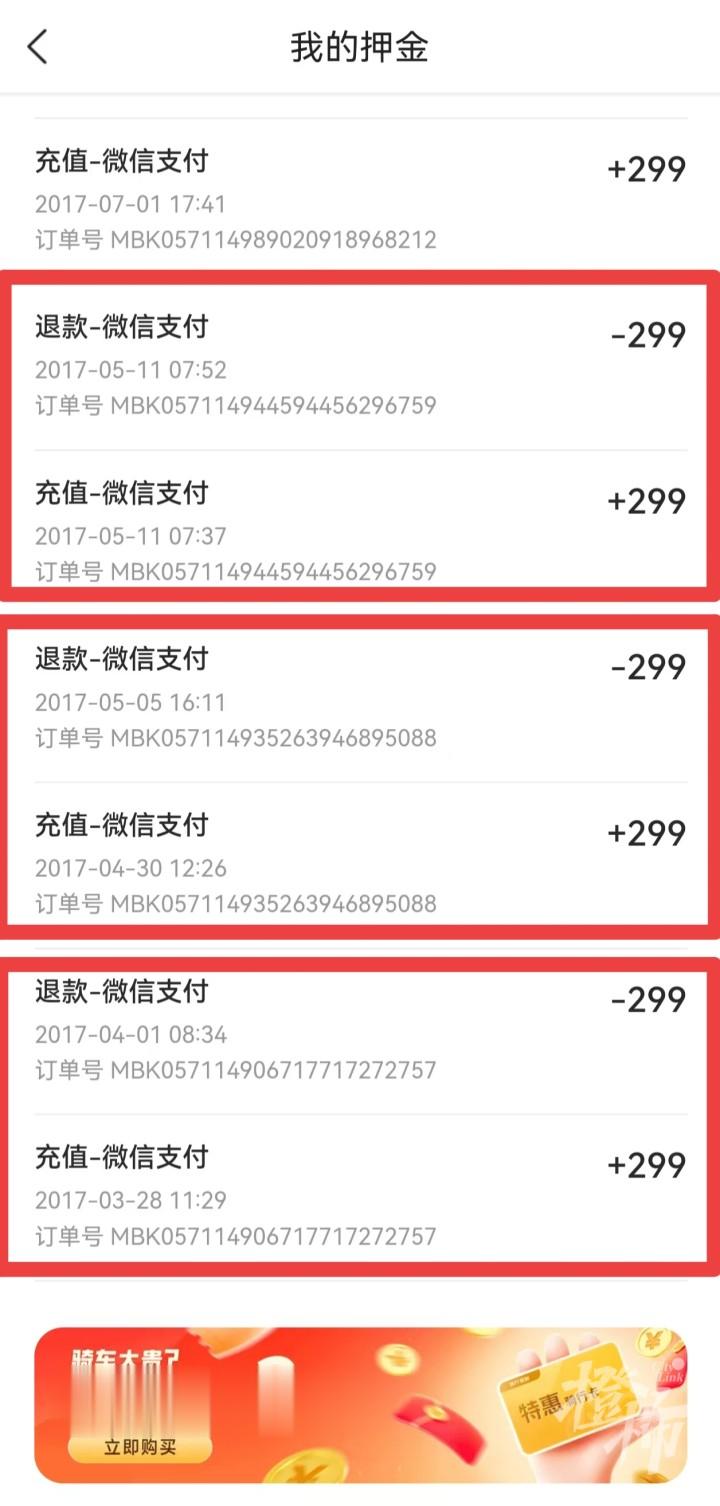 李先生说,那个时候租共享单车,每次都要暂扣押金,他经常使用美团和OFO的共享单车,前者租车押金是299元,后者租车押金是99元。