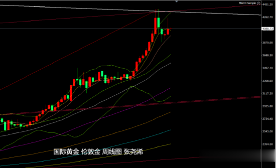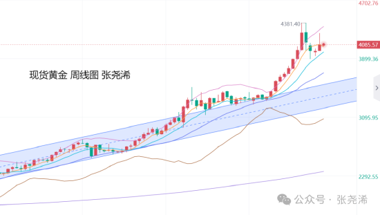 技术上,周线级别,金价上周冲高回落倒垂收线,但仍未跌至10周均线下方,而仍具有看涨前景,本周先行关注5/10周均线进行看涨反弹,如进一步走低,下方关注之前多次触底反弹攀升的中轨线及30周等均线支撑位置,也是继续入场看涨的机会。仍可等待再度触及4300美元或新高。
