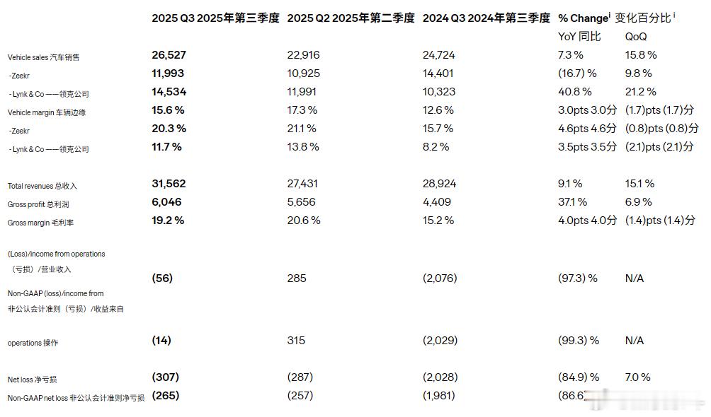 极氪发布2025年三季度财报2025年第三季度的汽车总交付量为140195辆,同比增长12.5%,环比增长7.1%。极氪品牌交付了52,860辆汽车,领克品牌交付了87,335辆汽车,其中72.4%来自新能源车型。2025年第三季度汽车销售额为人民币265.27亿元(37.26亿美元),比2024年第三季度增长7.3%,比2025年第二季度增长15.8%。2025年第三季度汽车利润率为15.6%,而2024年第三季度为12.6%,2025年第二季度为17.3%。2025年第三季度总收入为人民币315.62亿元(44.34亿美元),比2024年第三季度增长9.1%,比2025年第二季度增长15.1%。