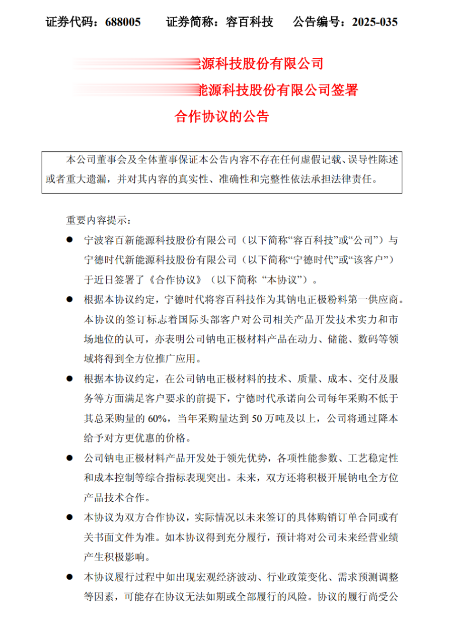 前一日,容百科技公告与电池巨头宁德时代(300750.SZ)签署合作协议,根据协议,宁德时代将容百科技列为钠电正极粉料第一供应商,并承诺每年向容百科技采购比例不低于总采购量的60%。