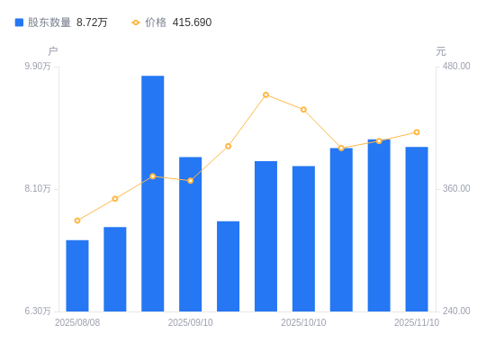 近一年(2024年11月20日至2025年11月10日),北方华创A股股东户数从8.11万户,增加至8.72万户,增幅7.57%,区间股价上涨29.31%。