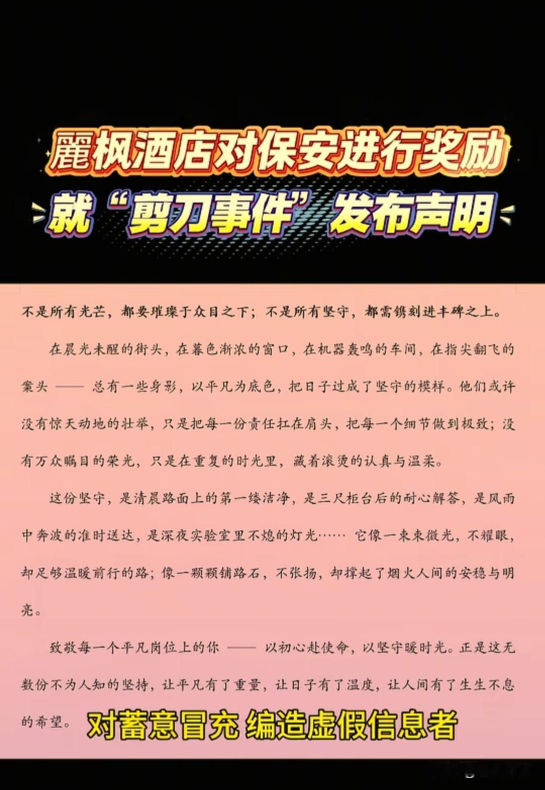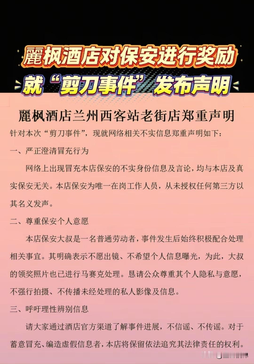 兰州廲枫酒店西客站老街店给保安在“剪刀事件”中的处理方式,决定对当事保安进行嘉奖,酒店认为保安的行为是尽职尽责之举,为他颁发了荣誉证书和奖金。 不得不说廲枫酒店此举还是很温暖的,酒店声明网络上有人冒充酒店保安,和一些不实言论,和酒店无关,保安大叔是一名普通劳动者,事件发生后始终积极配合处理相关事宜。 保安大叔明确表示自己做的事情属于职责范围之内的事情,不愿意出镜,不希望个人信息曝光,颁奖照片也打了马赛克。 酒店工作人员也解释了他们酒店的规定,不能向客人外借剪刀之类的利器,也是为了顾客的安全考虑,要是由于特殊原因借出去,保安在门口等候,客人尽快用完了由保安带回去前台。