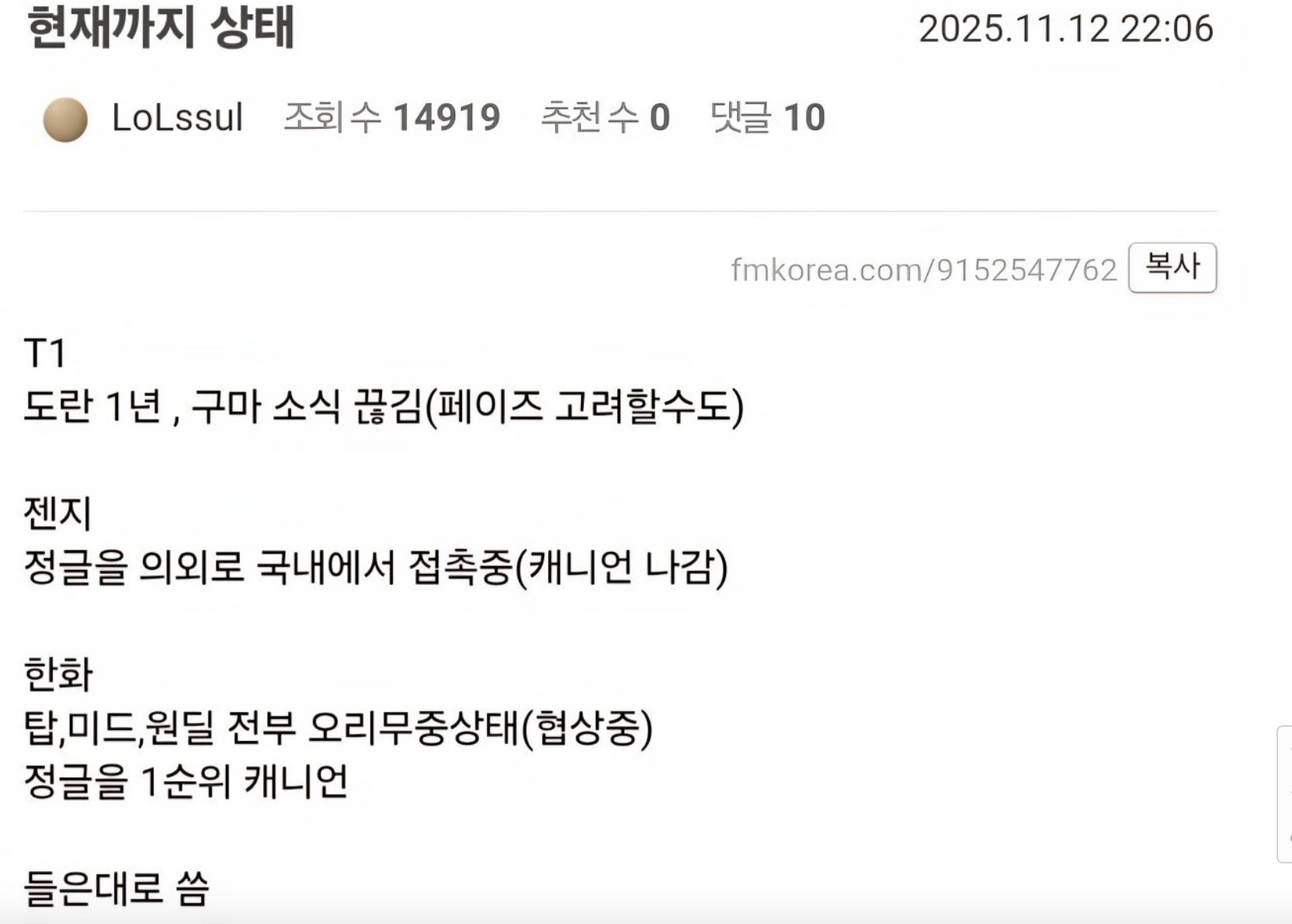 虎扑11月17日讯2025赛季转会期即将开启,T1官宣下路Gumayusi选手离队,韩网小道发文称HLE给Gumayusi选手超过20亿韩元(约1000万RMB),准备了两年合同。