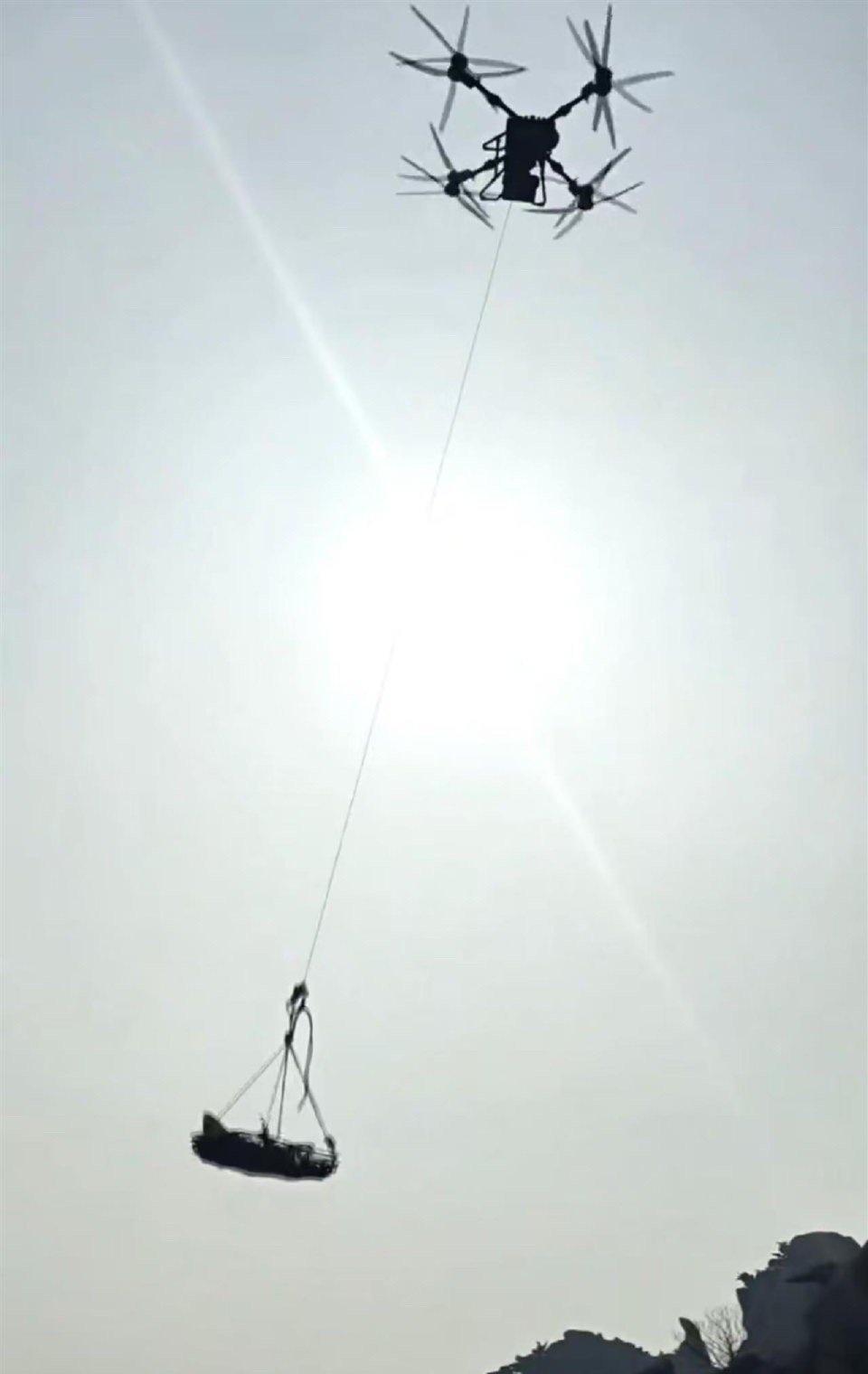 据网友发布视频,一架无人机吊着担架,缓缓从山间升起,担架抬着的是一具遗体。视频还