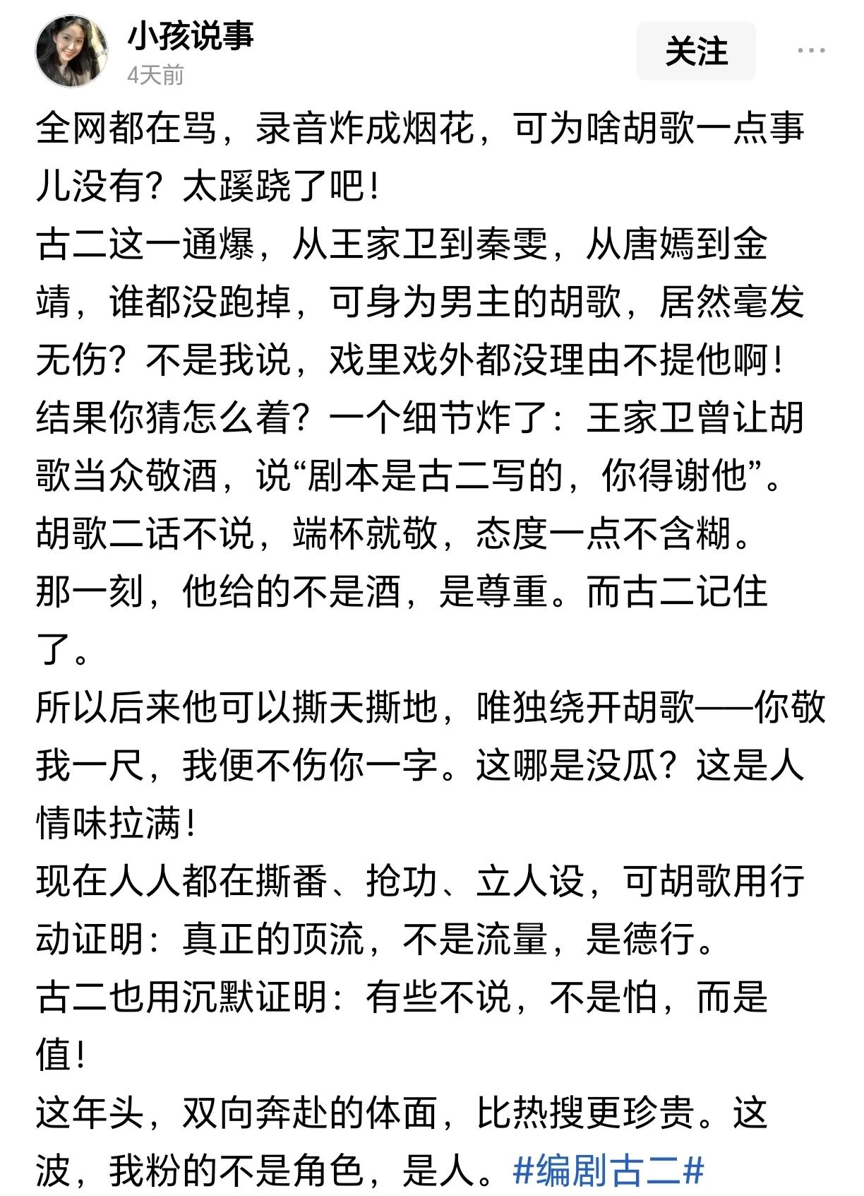 繁花剧组的瓜越吃越有。 编剧古二的爆料,几乎把整个剧组的人都手撕了个遍。唯独男主胡歌没有受到波及。 如果网上说的都是真的,那胡歌却实称得上对得起观众的喜爱。 无论是演技实力还是为人处世都没什么严重问题了。 繁花编剧风波