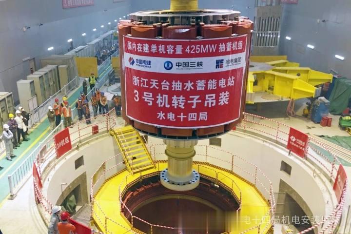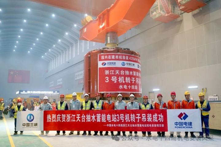 11月15日,浙江天台抽水蓄能电站3号机组发电机转子成功吊装就位,这标志着该机组正式进入总装阶段。