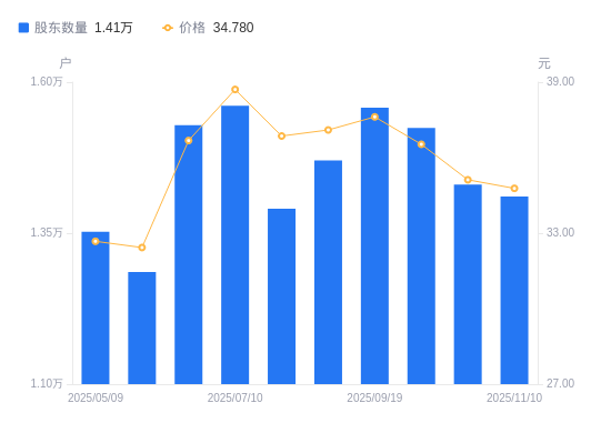 日期A股户数(户)流通A股户均持股数(股)户均持股市值(万元)2025-11-10141065723.7119.912025-10-20143053063.8010.762025-09-30152412875.6410.502025-09-19155772813.6110.582025-07-31147052980.4611.062025-07-18139043152.1611.622025-07-10156112807.4910.872025-06-30152862867.1810.522025-05-30128562351.127.622025-05-09135212235.487.30