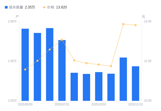 近一年(2024年11月20日至2025年11月10日),理邦仪器A股股东户数从2.43万户,减低至2.35万户,降幅3.33%,区间股价上涨32.21%。