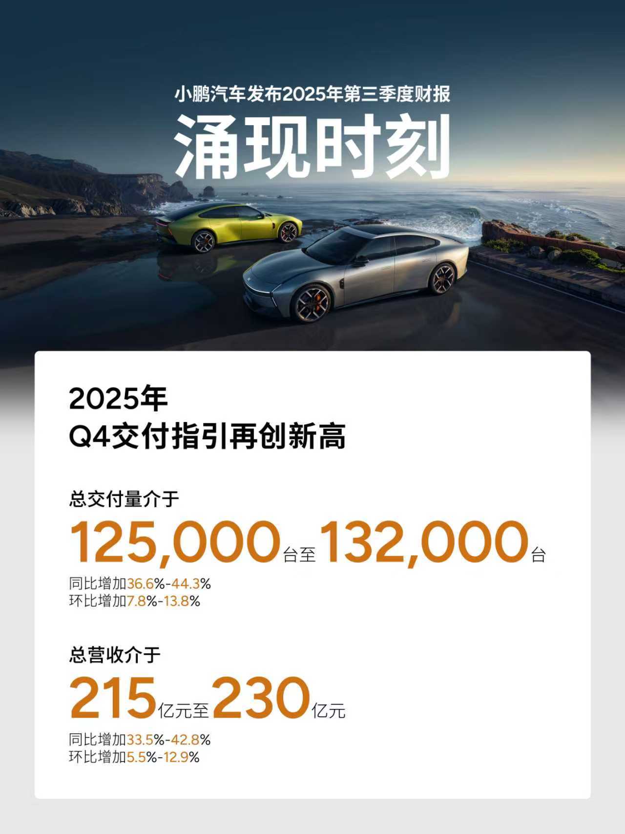 何小鹏:【四季度总交付量约为12.5万至13.2万台,收入约为人民币215亿元至230亿元】随着一车双能的产品周期开启,我预期四季度的总交付量约为12.5万至13.2万台,同比上升36.6%至44.3%。四季度收入预计约为人民币215亿元至230亿元,同比上升33.5%至42.8%。小鹏AI汽车的规模和市场份额正处在高速扩张的早期阶段,Robotaxi和人形机器人正在加速规模量产,我坚信小鹏汽车会成为中国和全球物理AI的引领者,为全球的客户和股东创造更大的价值。