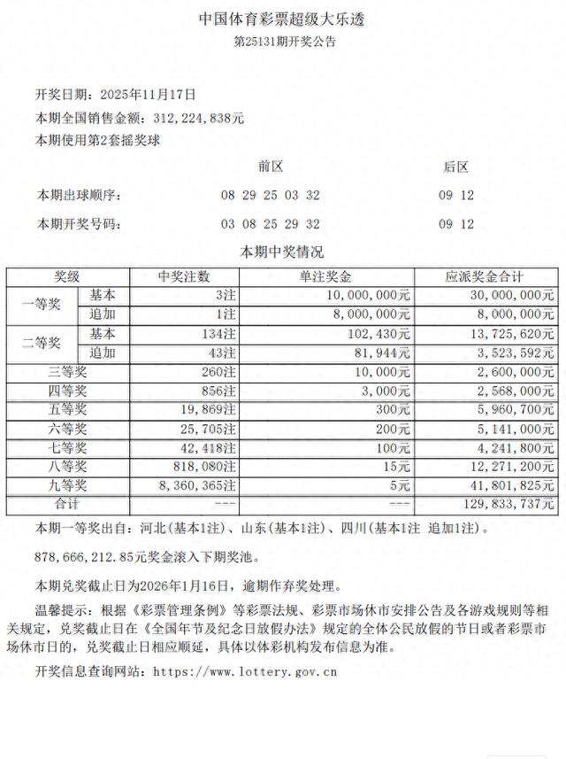 大皖新闻讯11月17日晚,中国体育彩票超级大乐透第25131期开奖公告发布,当期开出3注一等奖。