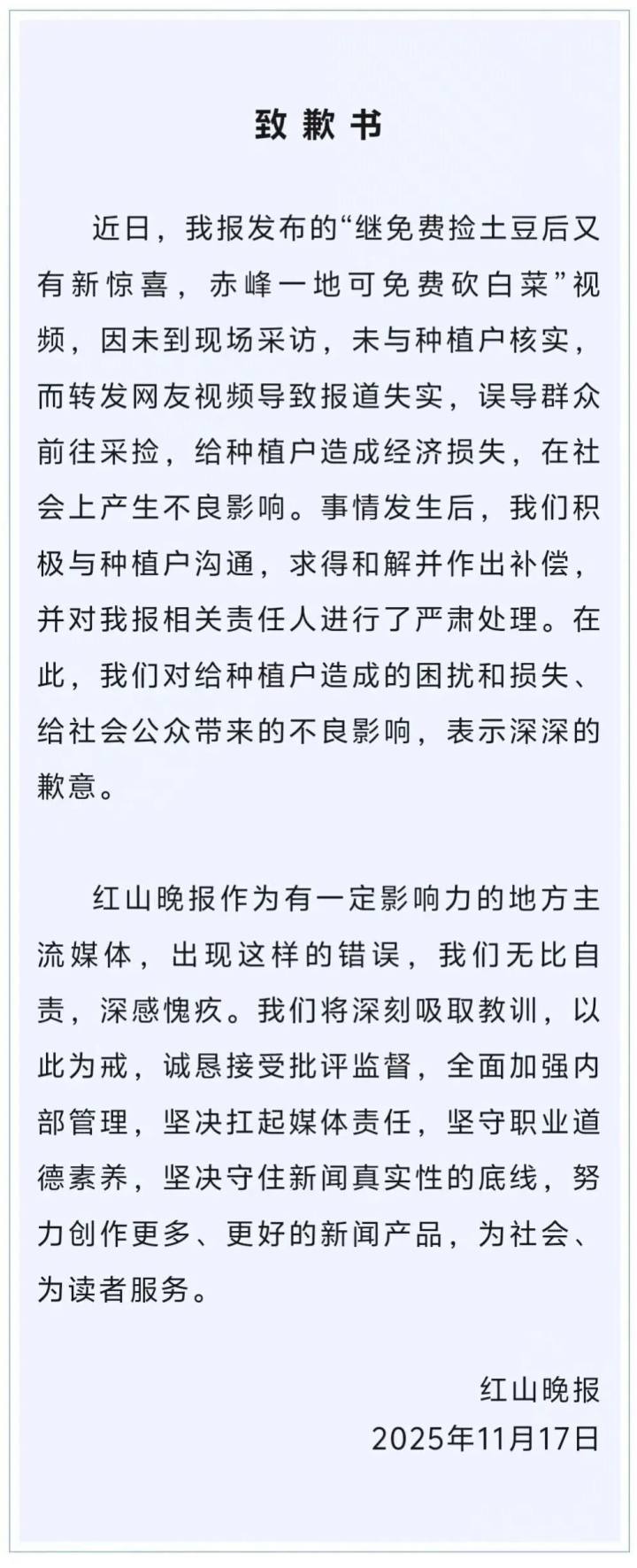 近日,我报发布的“继免费捡土豆后又有新惊喜,赤峰一地可免费砍白菜”视频,因未到现场采访,未与种植户核实而转发网友视频导致报道失实,误导群众前往采捡,给种植户造成经济损失,在社会上产生不良影响。事情发生后,我们积极与种植户沟通,求得和解并作出补偿,并对我报相关责任人进行了严肃处理。在此,我们对给种植户造成的困扰和损失给社会公众带来的不良影响,表示深深的歉意。