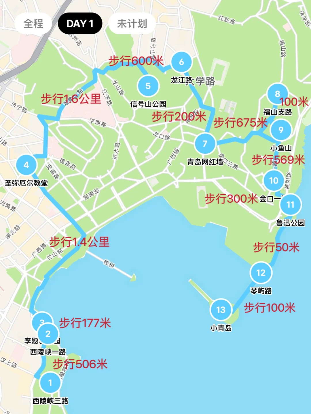 西陵峡三路➠西陵峡一路➠李慰农公园➠圣弥厄尔教堂➠信号山➠龙江路➠大学路➠福山支路➠小鱼山➠金口一路➠鲁迅公园➠琴屿路➠小青岛
