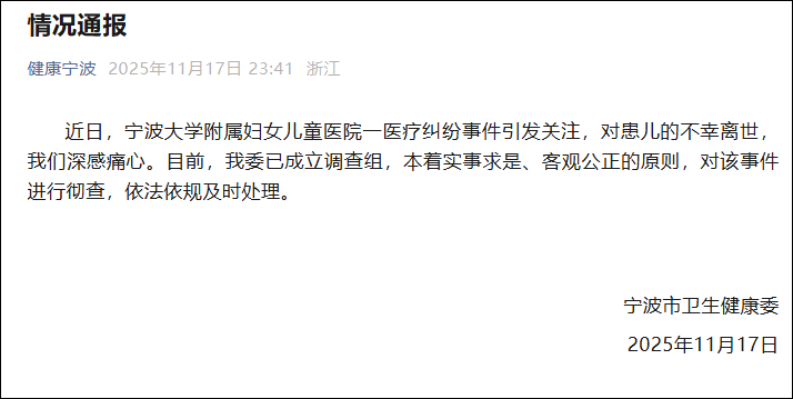 近日,宁波大学附属妇女儿童医院一医疗纠纷事件引发关注,对患儿的不幸离世,我们深感痛心。目前,我委已成立调查组,本着实事求是、客观公正的原则,对该事件进行彻查,依法依规及时处理。