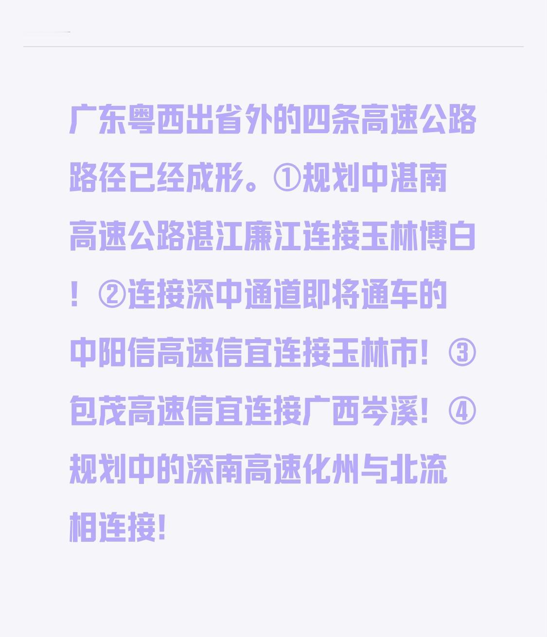 广东粤西出省的四条高速公路线路已具雏形。 ①规划中的湛南高速公路,将实现湛江廉江与玉林博白的连接。 ②即将通车的中阳信高速,通过信宜与玉林市相连,该高速还连接着深中通道。 ③已通车的包茂高速从信宜出发,可连接广西岑溪。 ④规划中的深南高速,会使化州和北流彼此连通。 以后广东粤西与广西桂南地区人民相互探亲旅游将会很便捷!