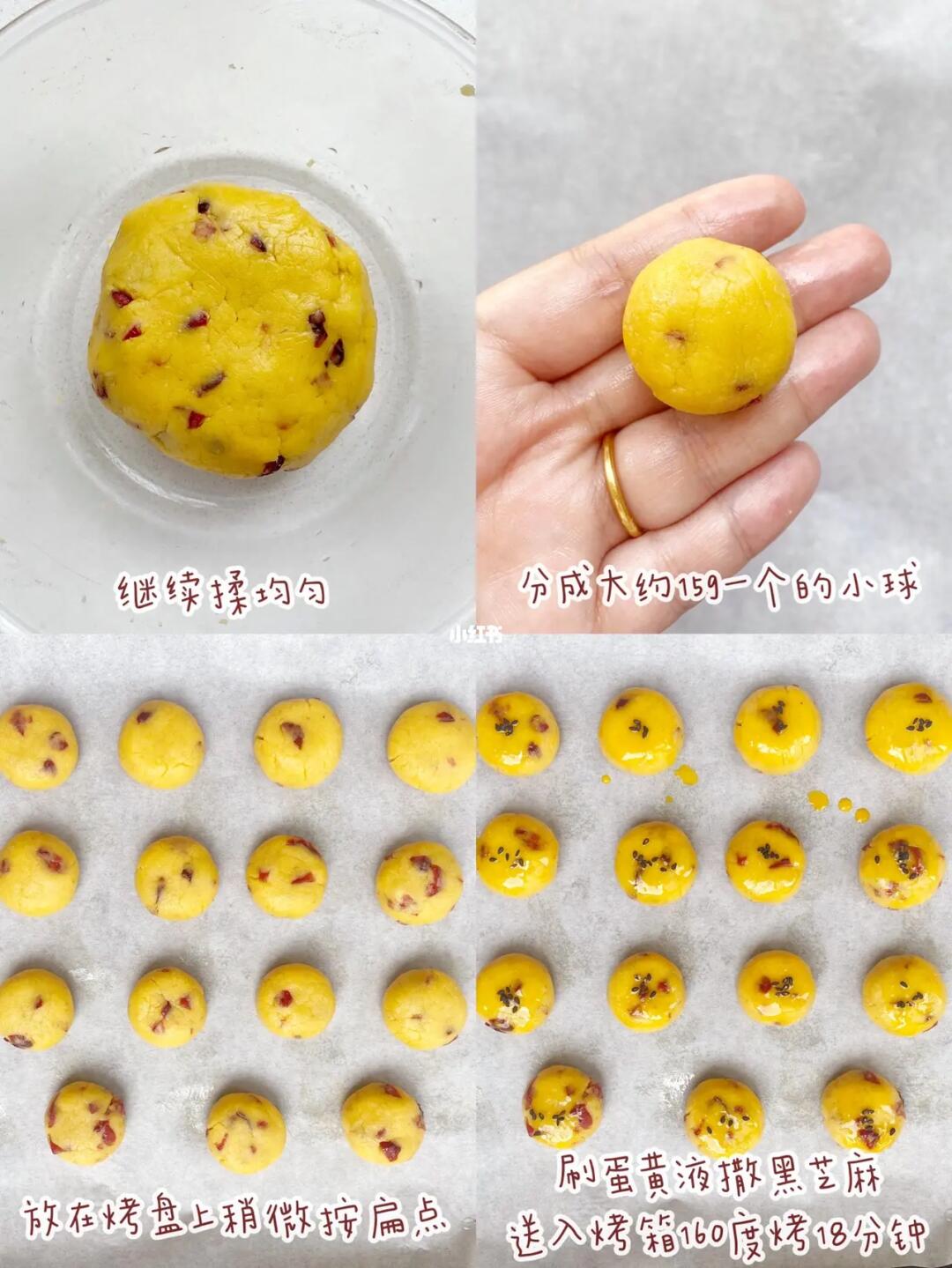 4⃣️分成约15g一个的小球,放在烤盘上,稍微按扁,表面刷蛋黄液撒黑芝麻。