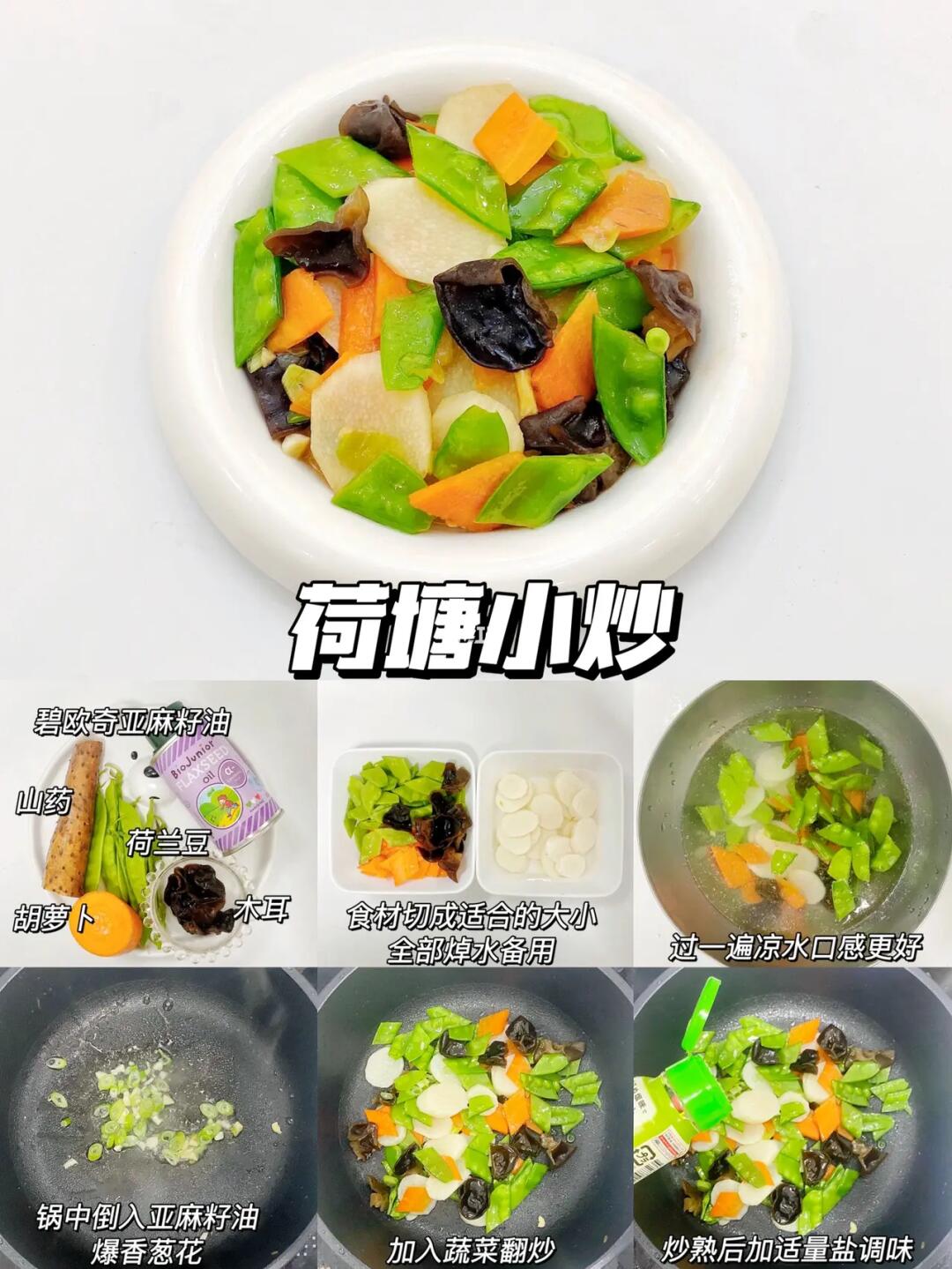 荷兰豆、山药、胡萝卜、木耳、葱花、碧欧奇亚麻籽油