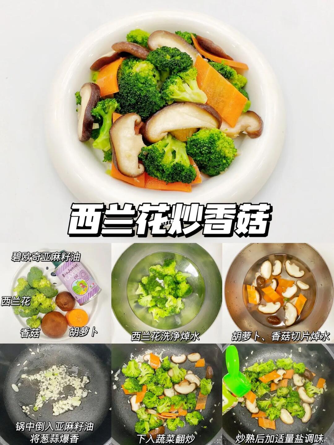 西蓝花、香菇、胡萝卜、葱蒜、碧欧奇亚麻籽油