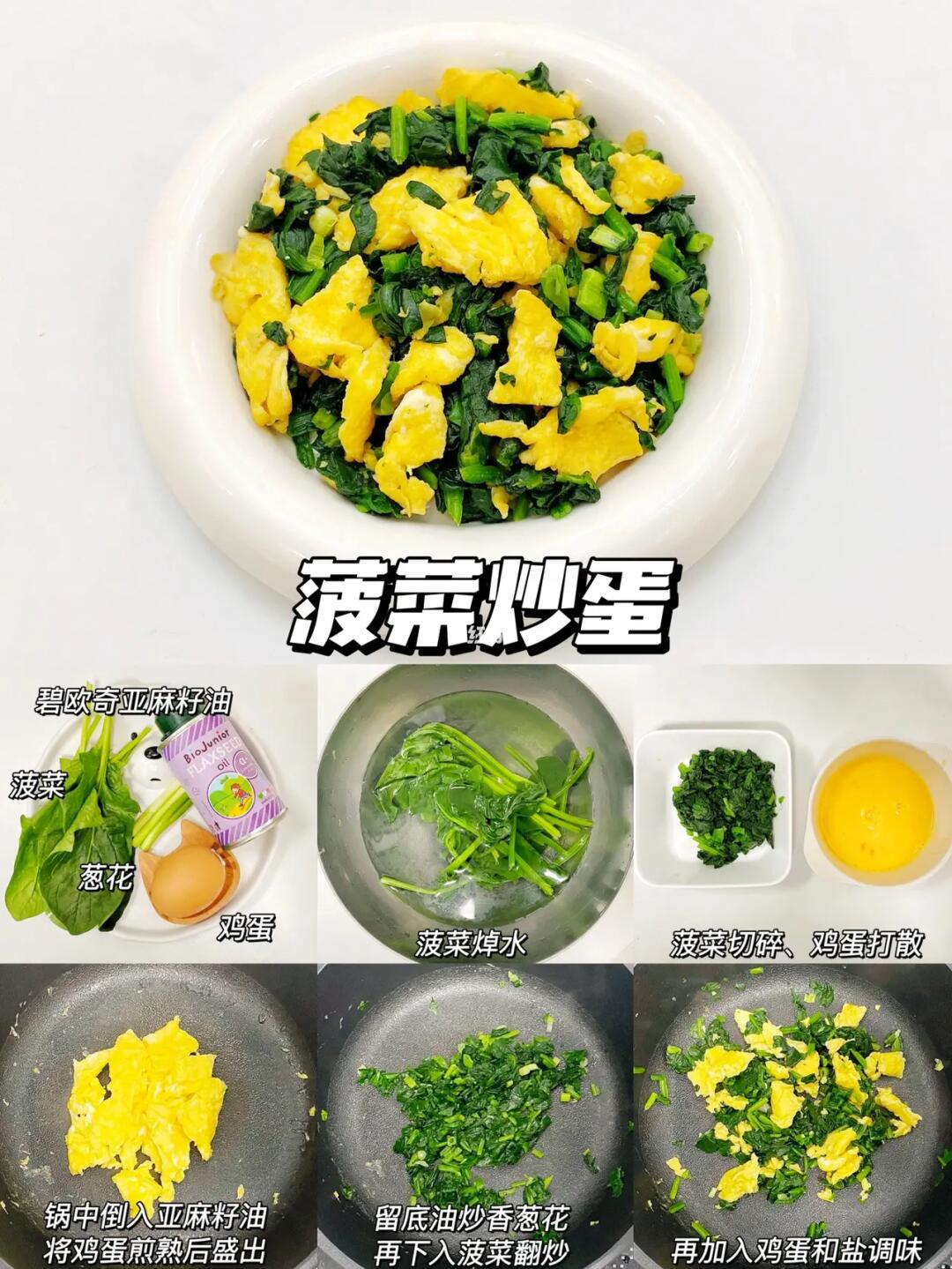 菠菜、鸡蛋、葱花、碧欧奇亚麻籽油