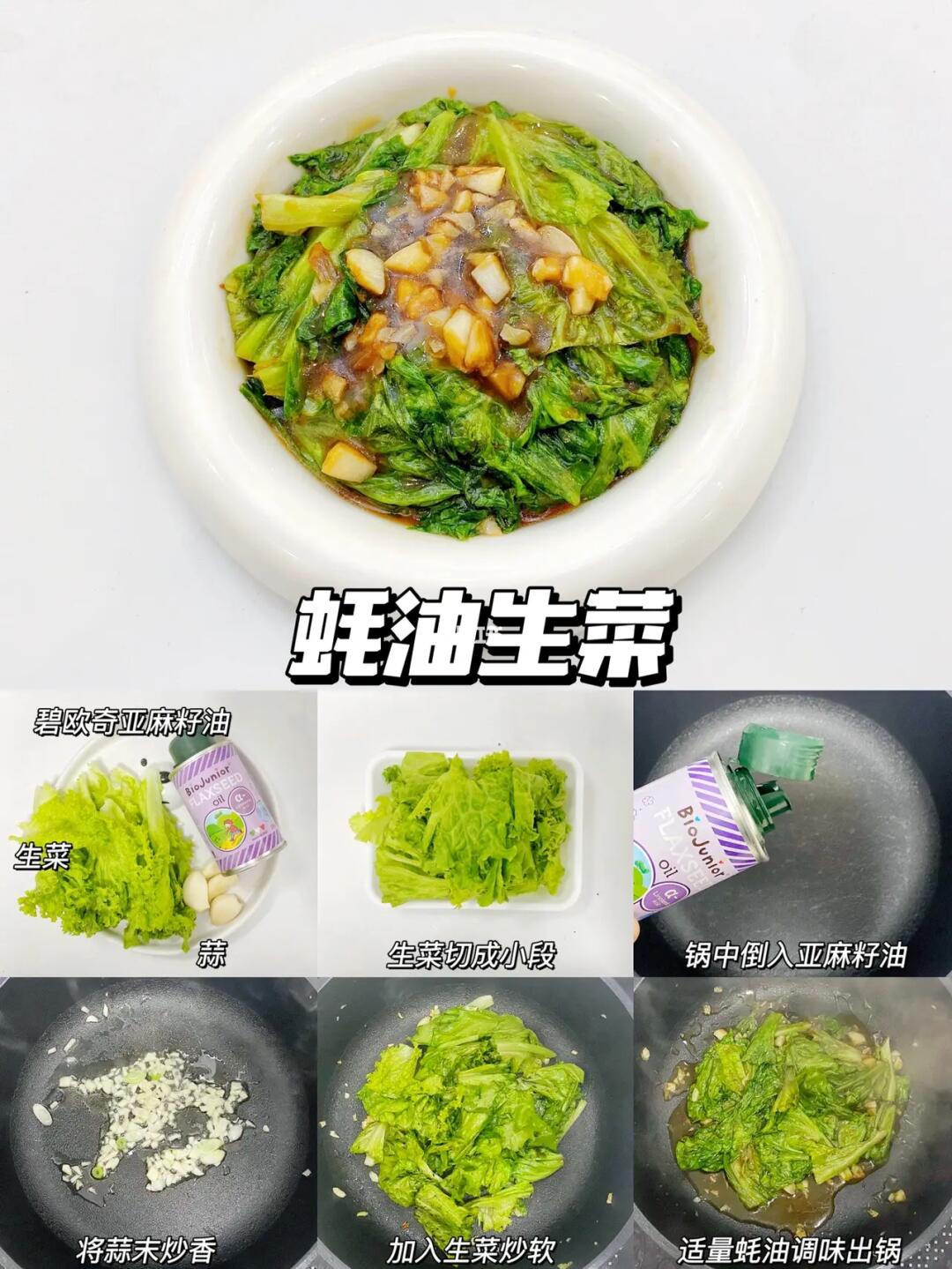 2.锅中倒入亚麻籽油,将蒜末炒香,再加入生菜炒软,一点蚝油拌匀即可。