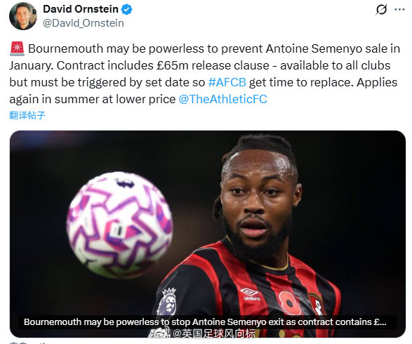 【塞约曼违约金曝光】TA名记DO:伯恩茅斯很可能无力阻止主力边锋塞曼约,在一月冬窗转会离队,尽管他们的愿望是留住这名25岁加纳国脚直至本赛季结束。因为在塞曼约的合同当中,有一条6500万英镑的违约金条款。2025年7月,伯恩茅斯成功与塞曼约续约5年,2030年6月到期。不过,正是在这次续约当中,加入了6500万英镑违约金条款,对所有球队有效。在夏窗和冬窗都有效,前提是在转会窗指定日期之前才能激活,这样可以给樱桃军团预留时间寻找替补人选。PS:这种带时限的违约金条款还是比较常见的,例如夏窗8月1日之前才能激活,冬窗1月15日之前才能激活。
