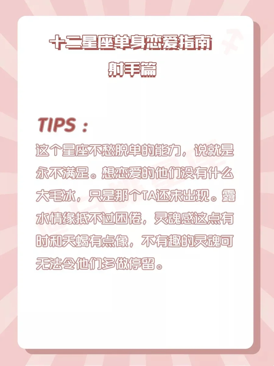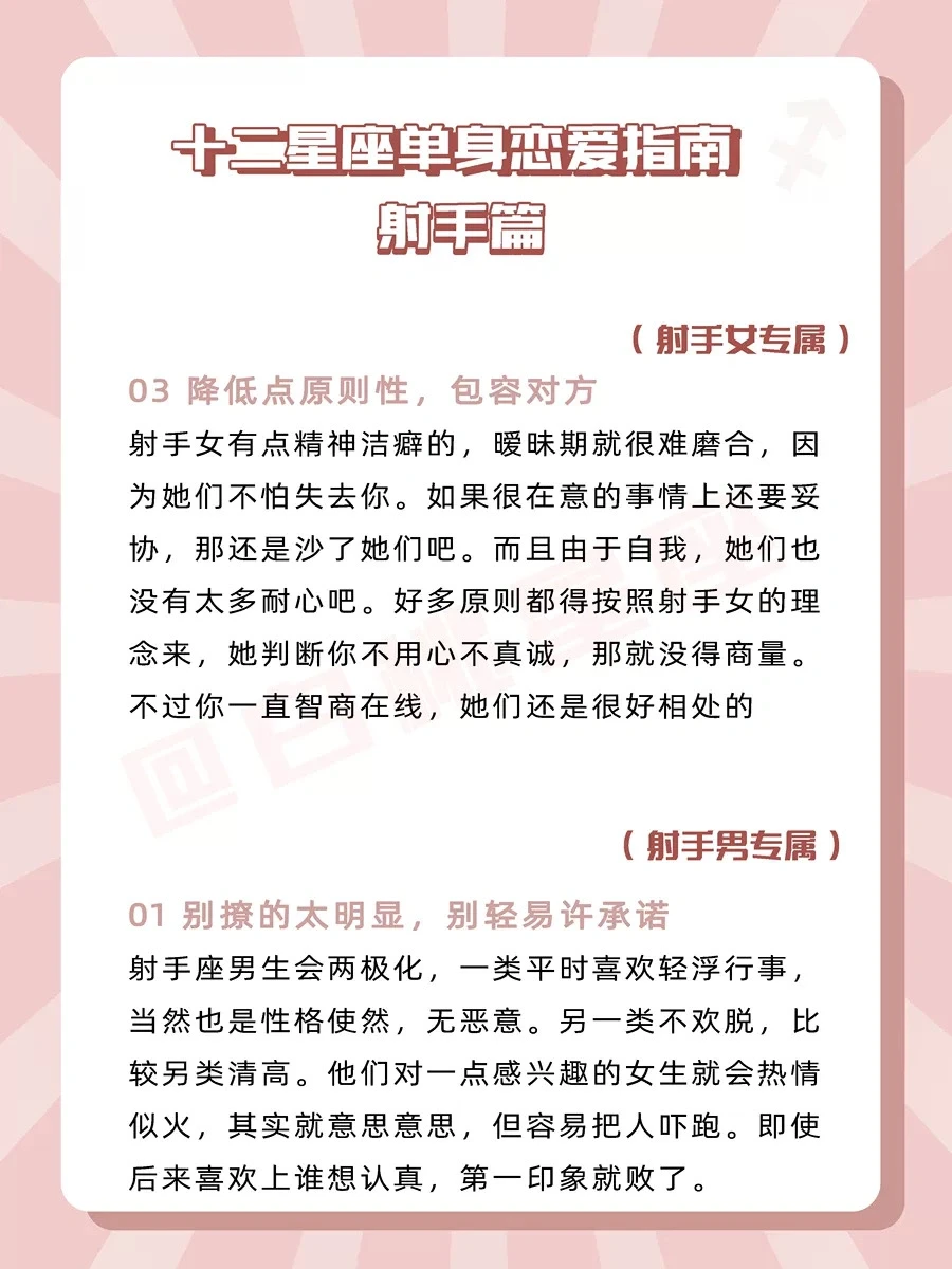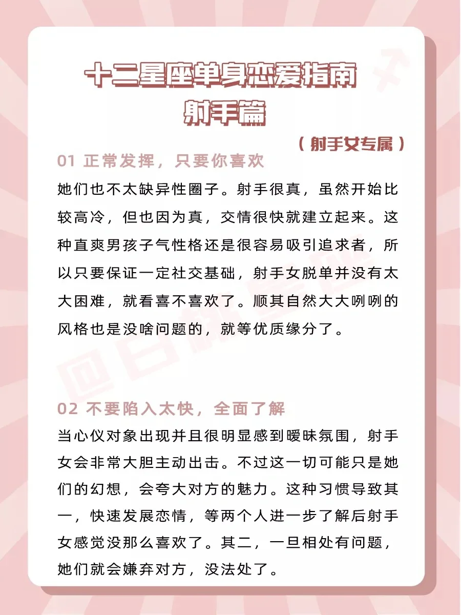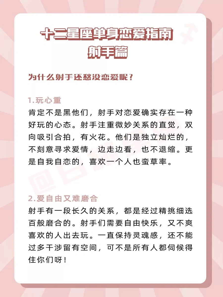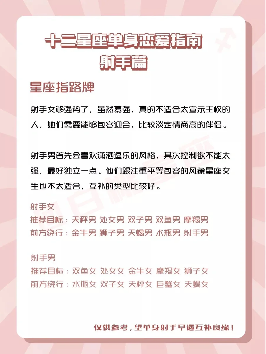 变动宫星座都会追随爱情的感觉,嗅到苗头就试试。不过脱单就要看缘分了,不得不说射手有一段长久的关系,都是经过精挑细选,百般磨合的。吸引篇也提过,射手们需要自由快乐,又不爽喜欢的人出去玩。