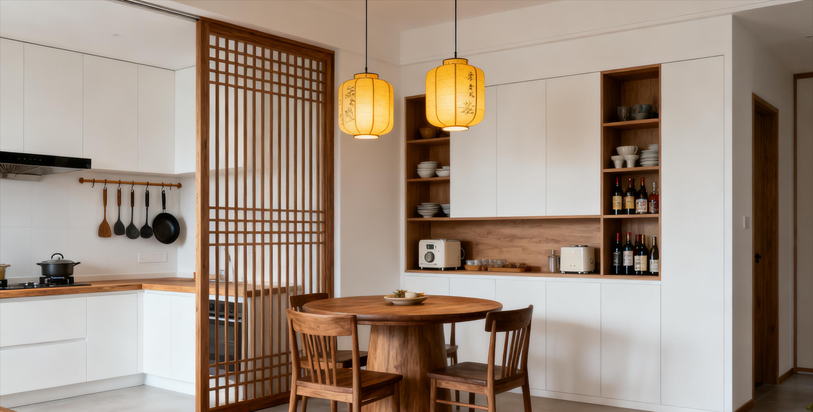 采用餐厨一体化设计,拆除厨房隔墙,扩大空间感,定制L 型白色橱柜,搭配原木色台面,形成干净利落的对比,墙面安装挂杆系统,悬挂锅铲、勺子等厨具,释放台面空间。餐厅定制嵌入式餐边柜,分区收纳餐具、酒水和小电器选用1.2m 原木圆桌,搭配 4 把简约靠背椅(座高 45cm),围坐舒适,餐桌上方悬挂两盏暖黄色中式吊灯,增添用餐仪式感