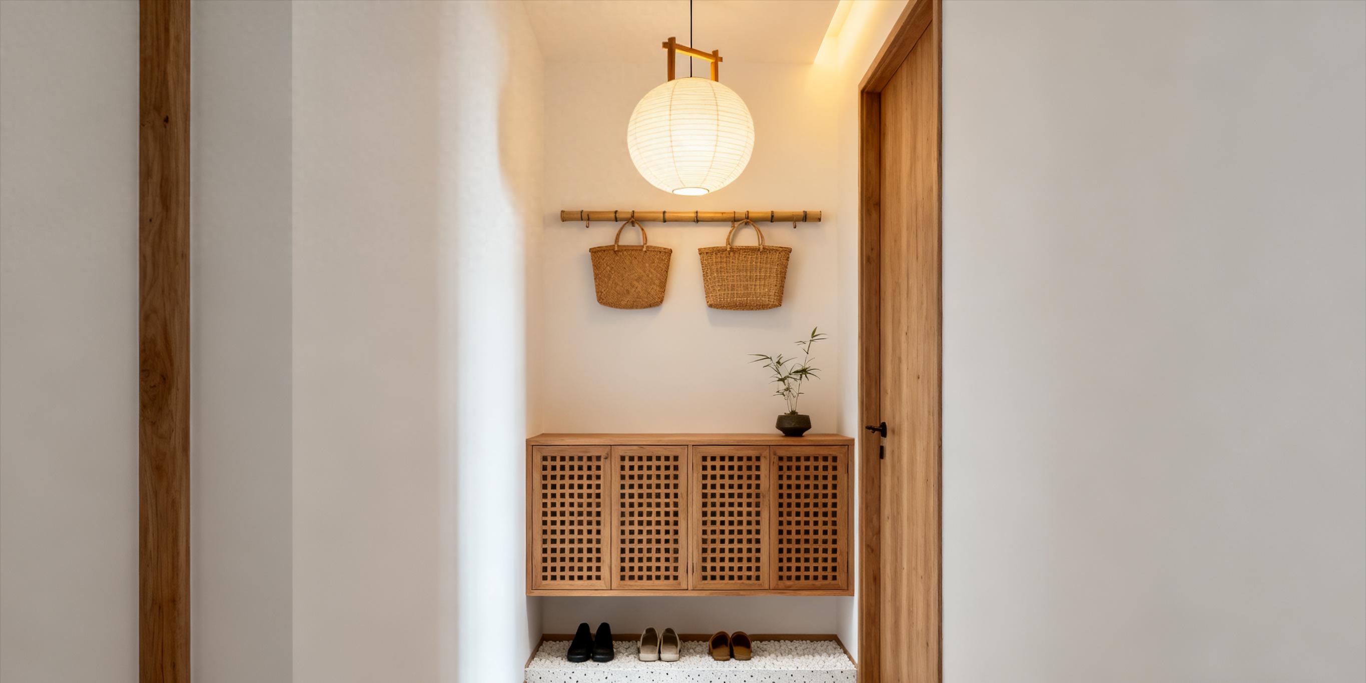 定制镂空原木鞋柜(宽 120cm× 深 35cm),上下留白,减轻体量感,墙面安装竹编挂衣架,下方设置白色水磨石换鞋区,与室内原木色自然区分,天花板垂落纸罩木架灯笼(直径 30cm),暖黄灯光 (2700K) 营造温馨入户氛围