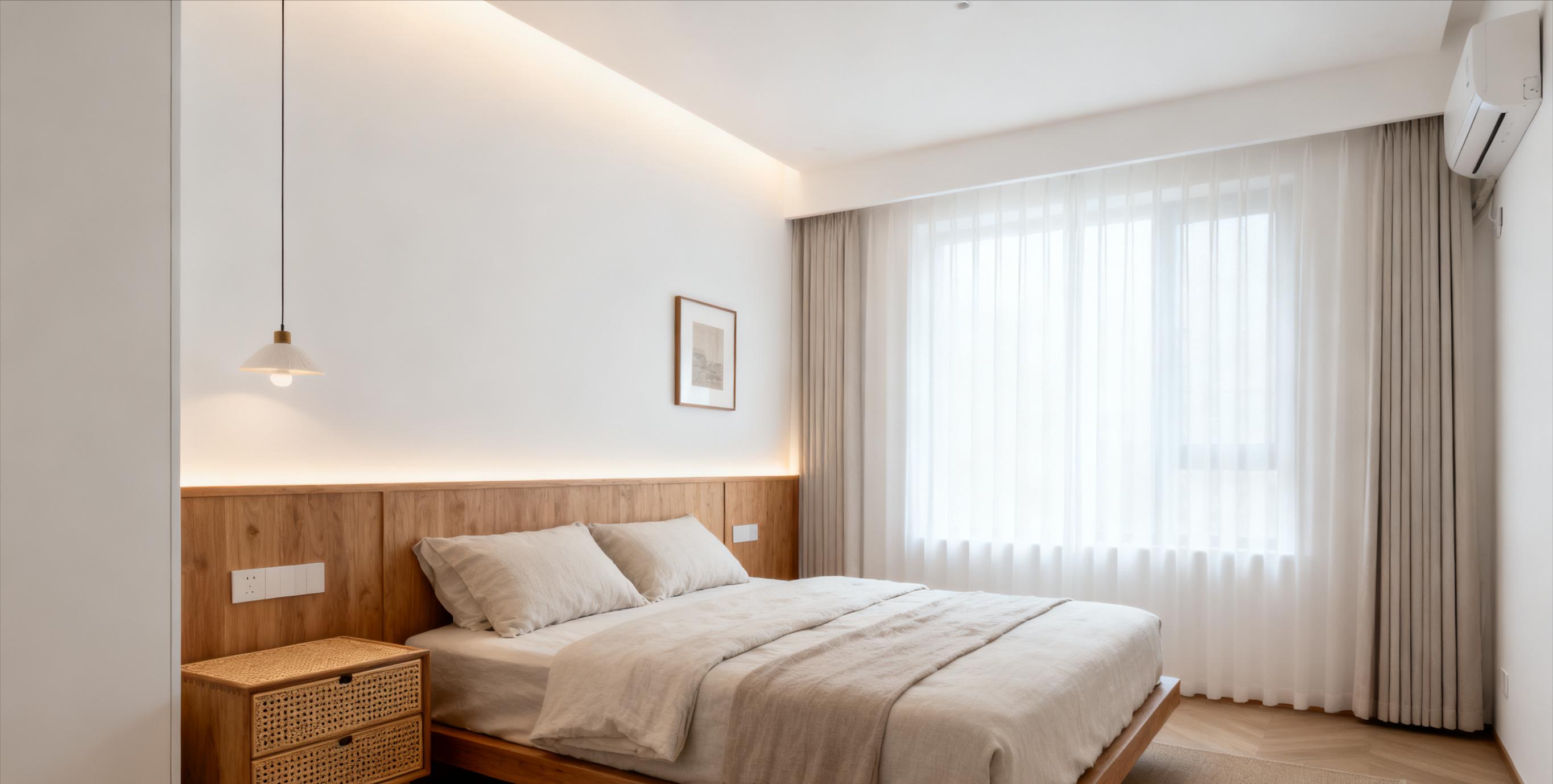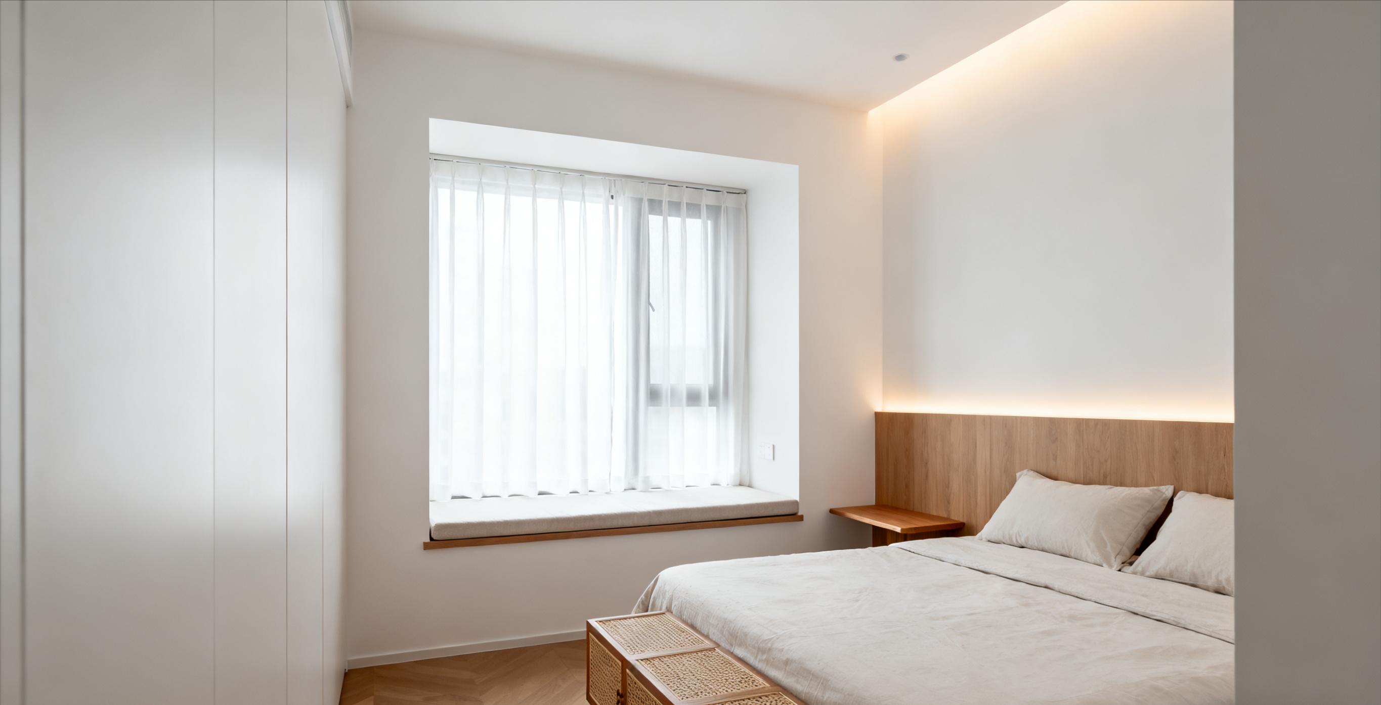 空间有限,采用1.2m 窄床紧贴墙面,留出宽敞通道,取消传统床头柜,改用小巧边几(宽 40cm),节省空间,窗下定制45cm 深飘窗柜,上铺软垫,白天休闲,晚上储物