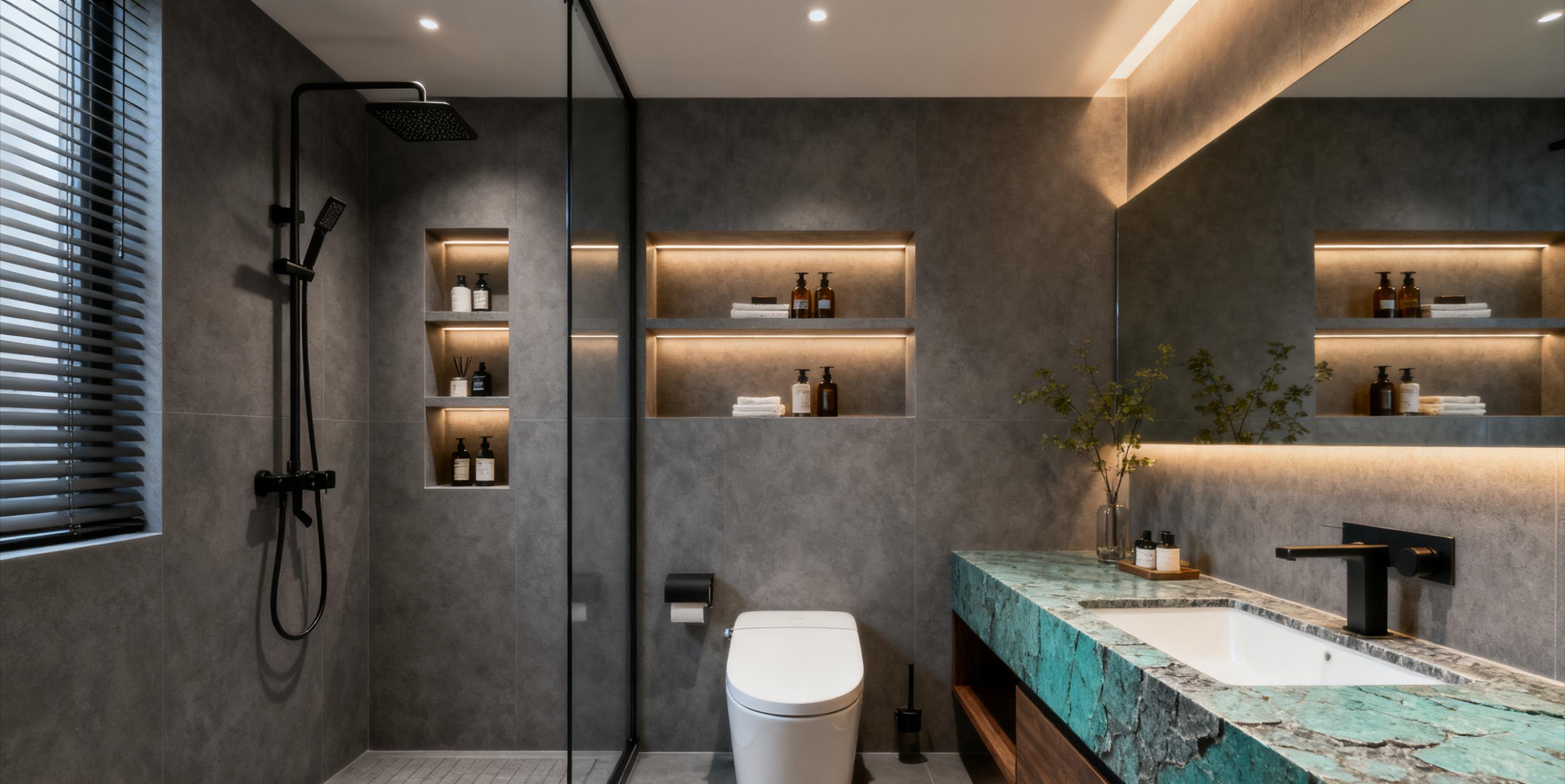 采用干湿三分离设计,地面选用灰色哑光砖,耐脏十分好清洁,淋浴区墙面打造三层壁龛,放置沐浴用品,不占空间。浴室柜选择台下盆 + 仿青石岩板台面,简洁大方。