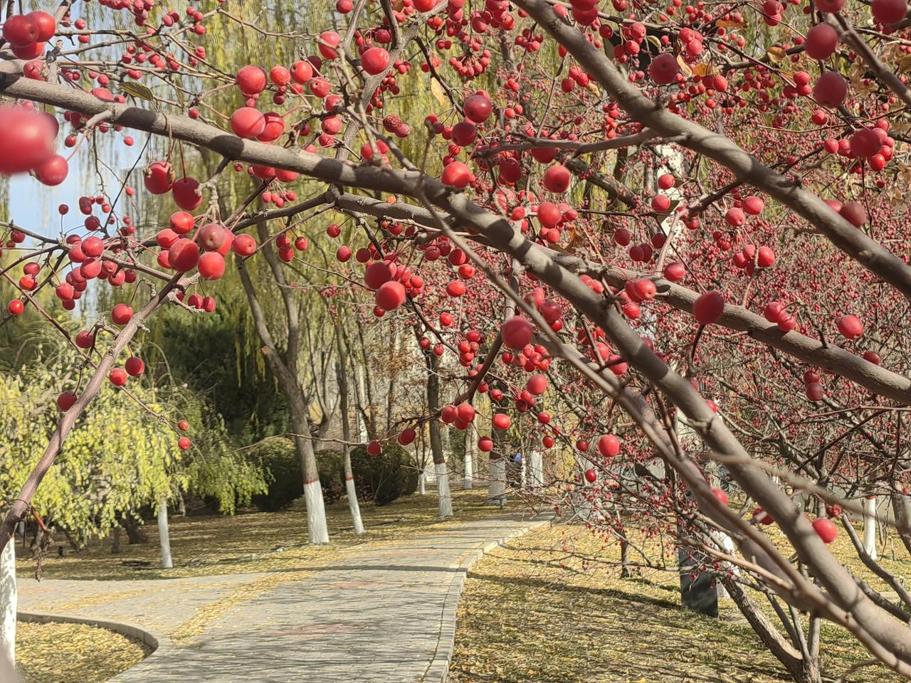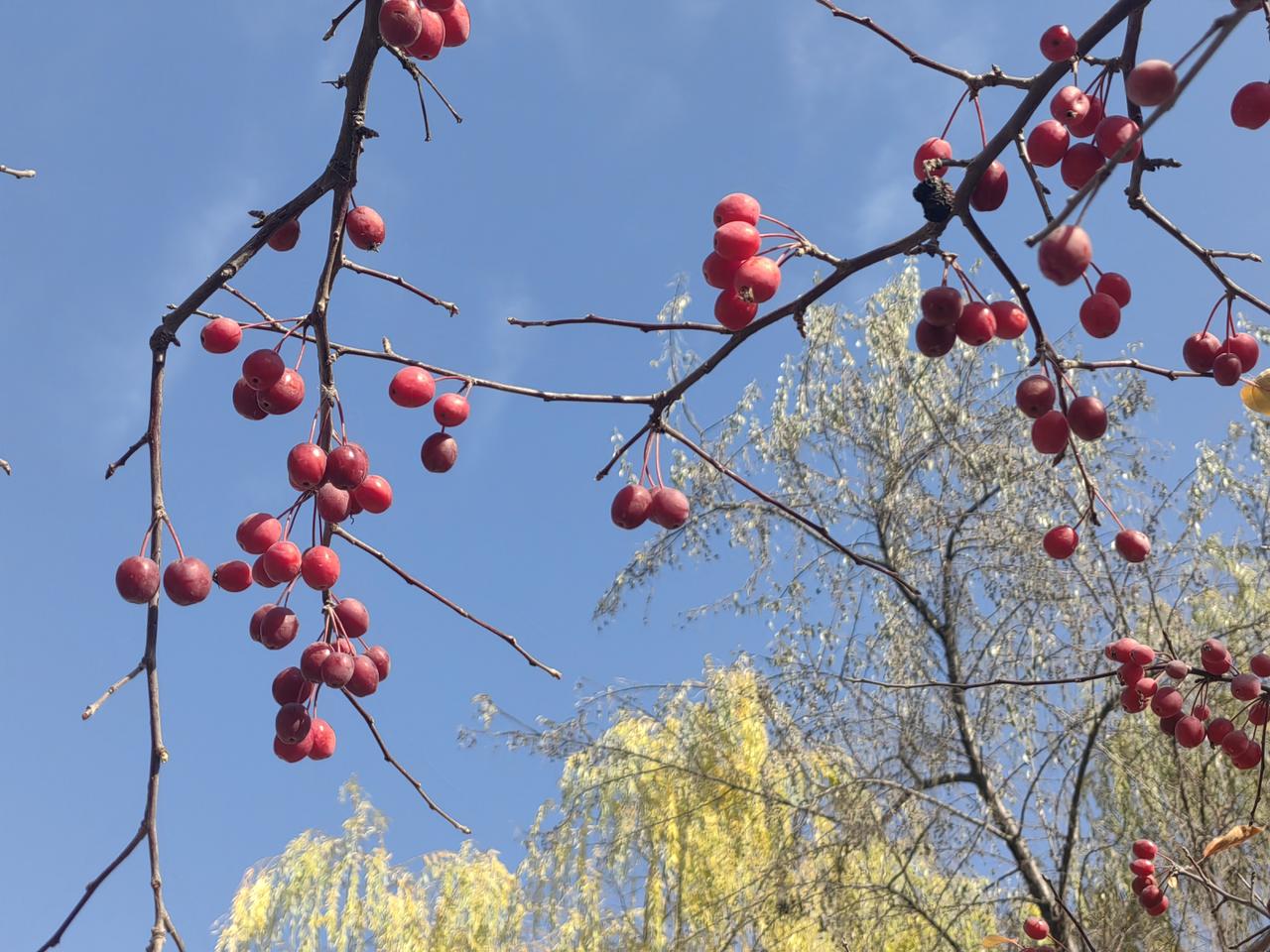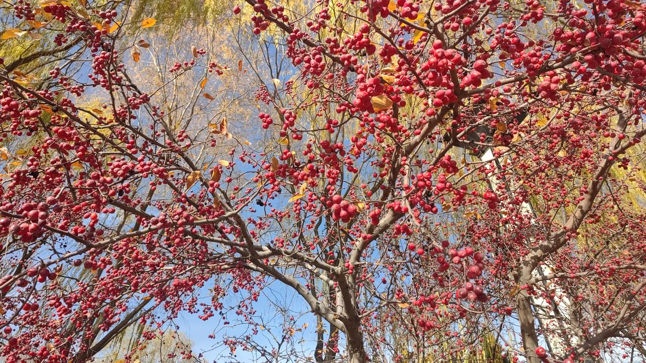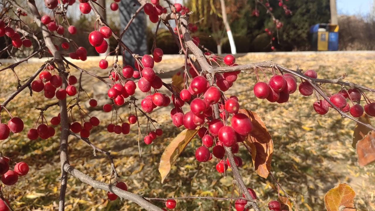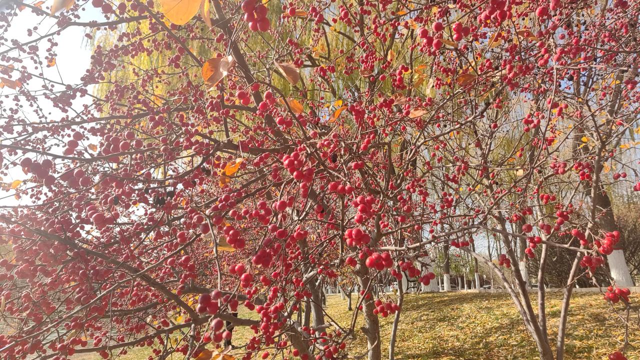 初冬,去银川典农河边散步,竟邂逅了满树火红的海棠果。那一个个果实小巧玲珑,像被霜吻过的胭脂,又似玛瑙般缀满枝头,连风里都弥漫着甜香。清晨,露珠悬在红果尖上,宛如坠落的晨星。鸟儿在叽叽喳喳,在树枝间跳来跳去,啄食红果子。 海棠自古受文人青睐,苏轼曾赞海棠花娇艳:“东风袅袅泛崇光,香雾空蒙月转廊。只恐夜深花睡去,故烧高烛照红妆”。而冬日典农河边的海棠果,更添坚韧之美。在万物沉睡的季节,它们在寒风中摇曳,寓意着生命的坚韧与希望。看着这些海棠果,心中满是温暖,也明白了要像它们一样,勇敢绽放光彩。 山野海棠