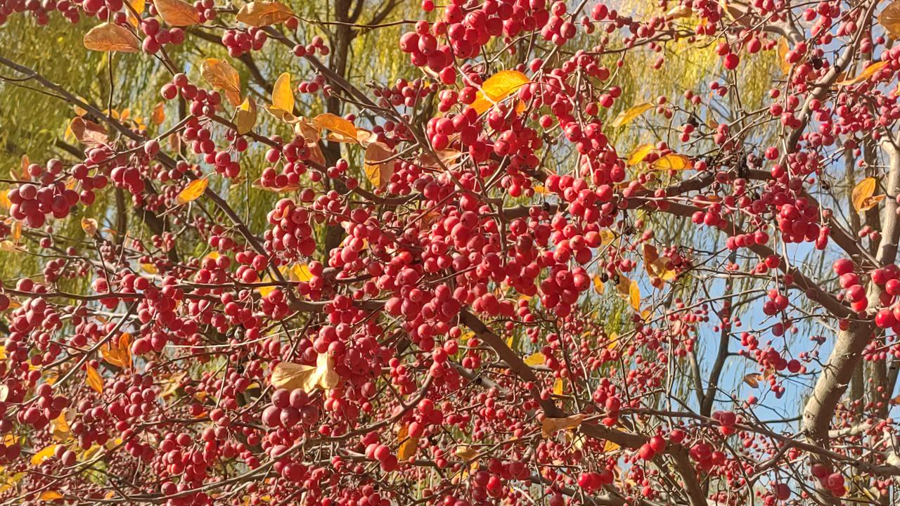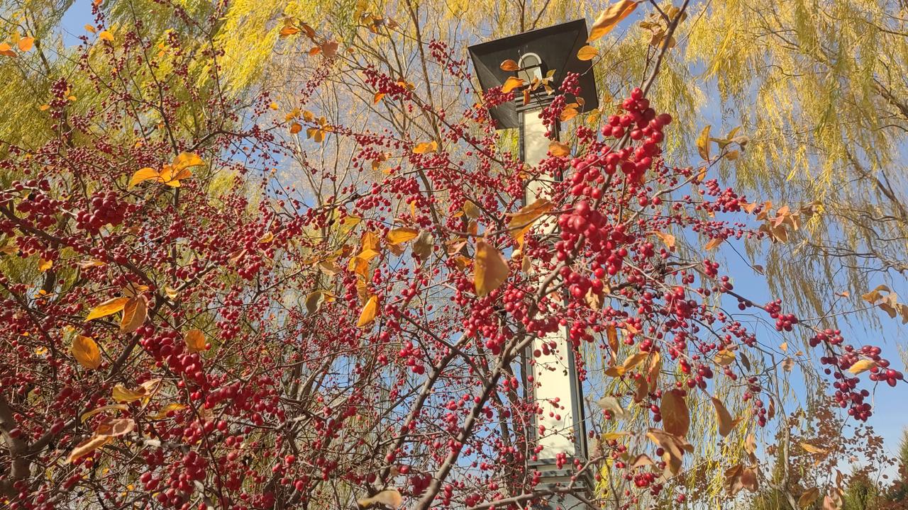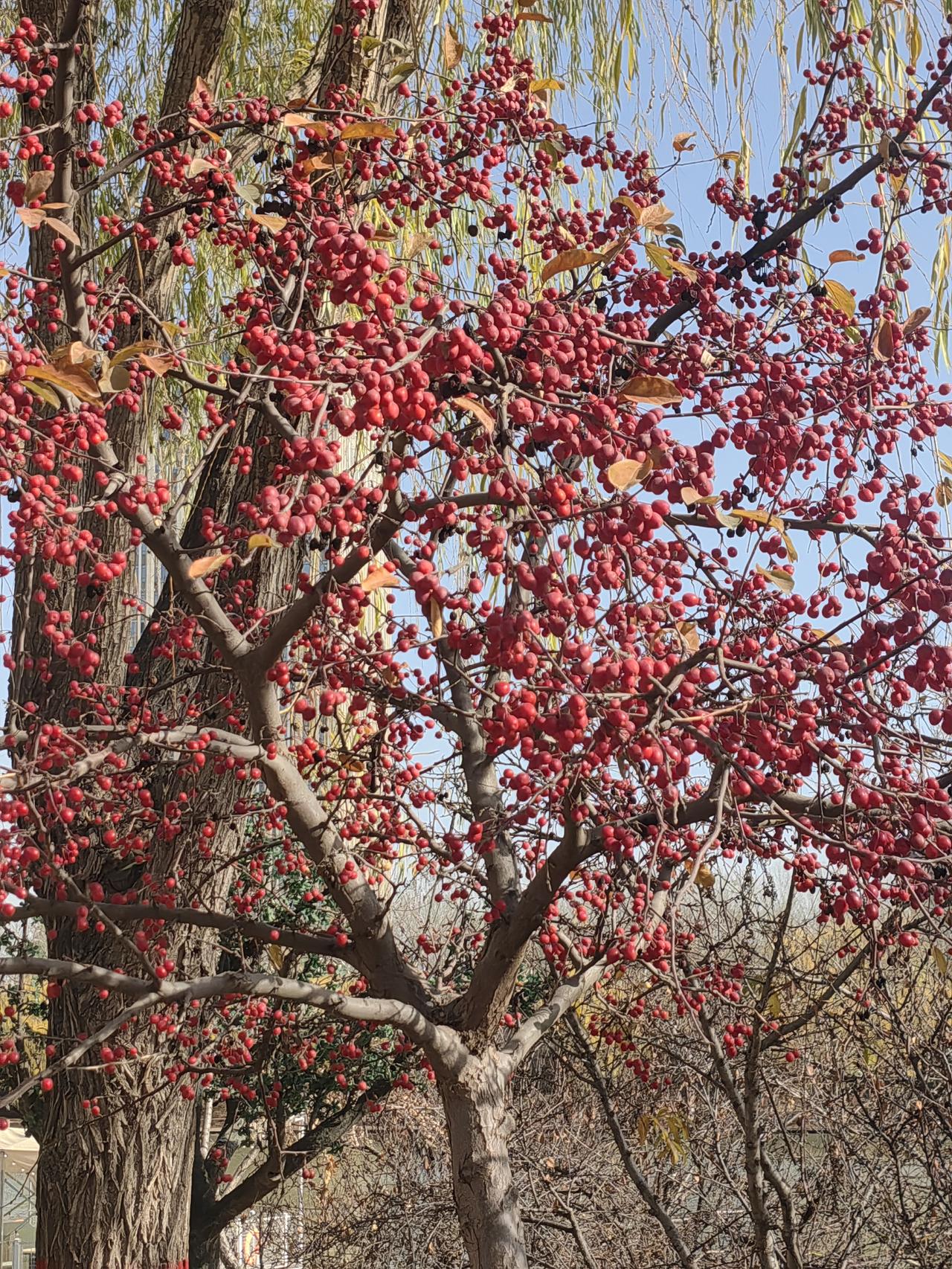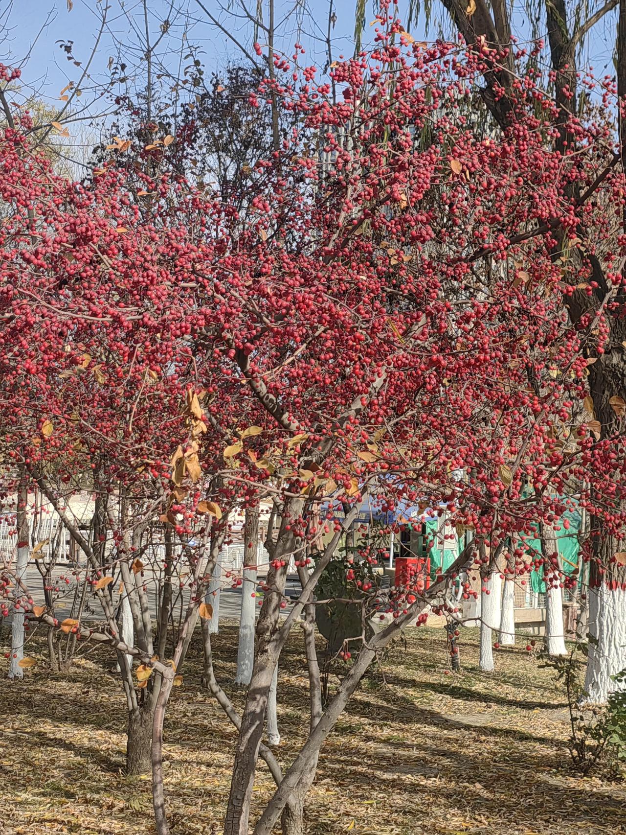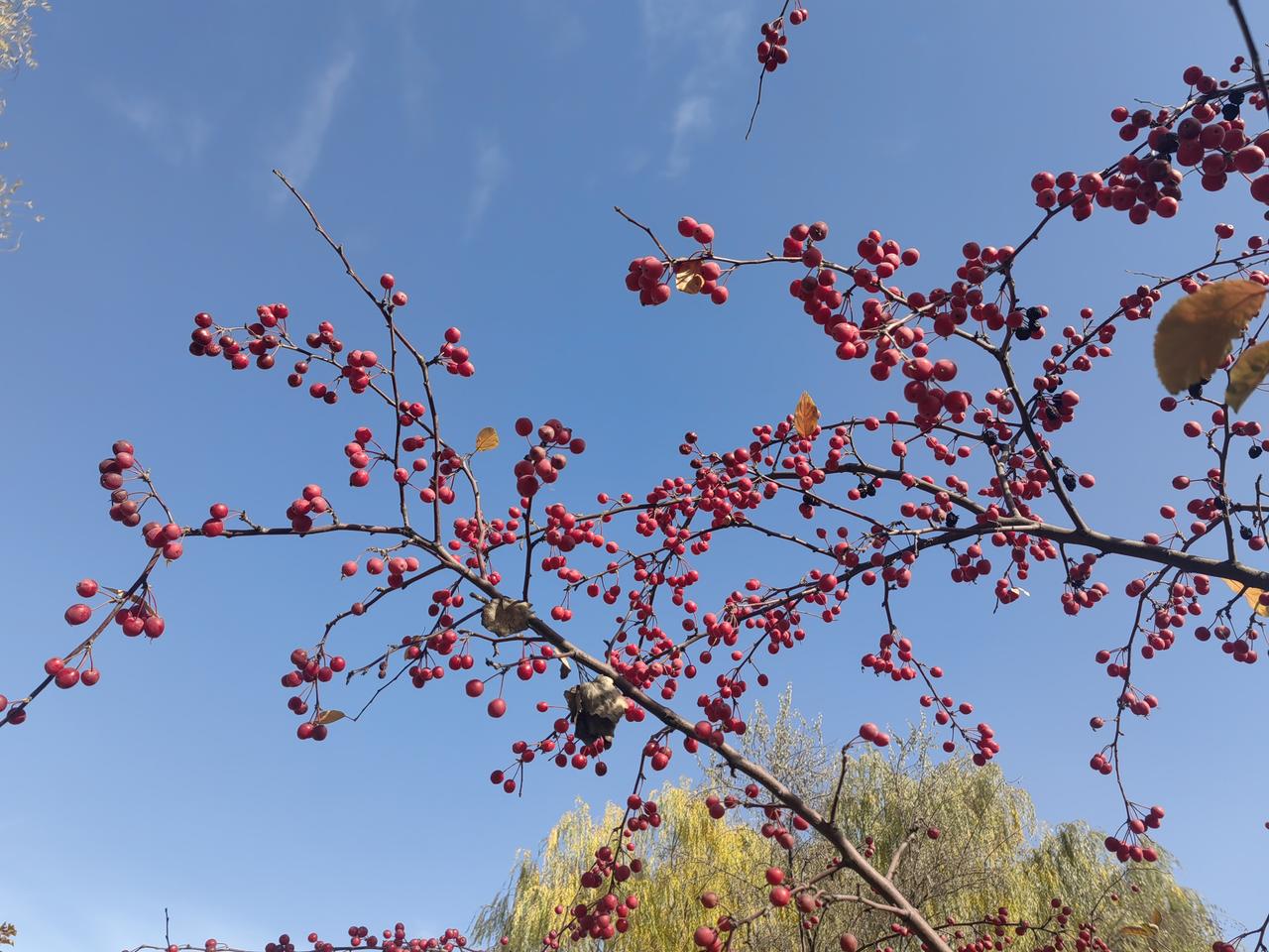 初冬,去银川典农河边散步,竟邂逅了满树火红的海棠果。那一个个果实小巧玲珑,像被霜吻过的胭脂,又似玛瑙般缀满枝头,连风里都弥漫着甜香。清晨,露珠悬在红果尖上,宛如坠落的晨星。鸟儿在叽叽喳喳,在树枝间跳来跳去,啄食红果子。 海棠自古受文人青睐,苏轼曾赞海棠花娇艳:“东风袅袅泛崇光,香雾空蒙月转廊。只恐夜深花睡去,故烧高烛照红妆”。而冬日典农河边的海棠果,更添坚韧之美。在万物沉睡的季节,它们在寒风中摇曳,寓意着生命的坚韧与希望。看着这些海棠果,心中满是温暖,也明白了要像它们一样,勇敢绽放光彩。 山野海棠