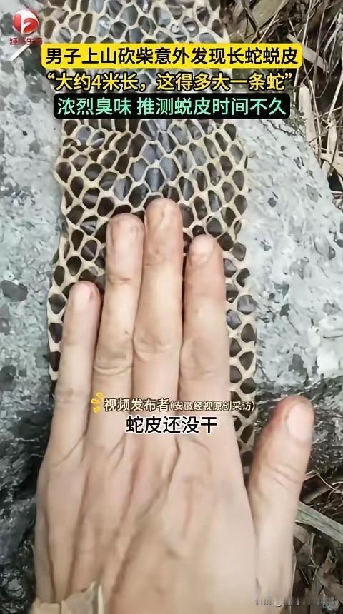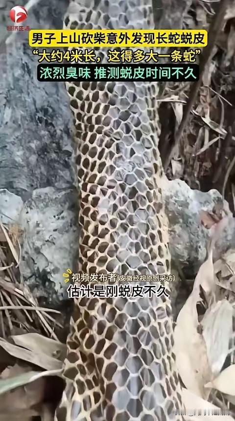 “活久见!”近日,广西河池,一男子上山砍柴时,突然闻到周围有一股恶臭味,他仔细寻找一番,竟找到一张4米长的蛇皮!男子壮着胆子上手摸了下,发现蛇皮还没有干,估计蛇刚离开没多久。网友:看着像是眼镜王蛇! 那股味道特别冲鼻,男子常年在山里走动,一闻就知道不对劲。他顺着臭味找过去,脚下踩着枯枝落叶,心里直发毛。果然,在一堆枯叶里发现了那条斑斑驳驳的蛇蜕。 蛇皮摊开了足足有四米长,最宽的地方比成年人的手掌还要宽出一大截。蛇蜕上的鳞片纹路清晰可见,摸上去还带着点湿凉的触感,这说明蛇刚离开这里不久。男子站在原地,四周静得能听见自己的心跳,他忍不住后怕,要是碰上的不是蛇皮而是大蛇本身,那可真不敢想。 有网友看了视频,猜测这可能是眼镜王蛇留下的。眼镜王蛇确实是世界上体型最大的毒蛇之一,成年个体平均体长就能达到3到4米。它们在广西山林里有分布,名气很大。 蛇蜕在自然环境下可能会被拉长、折叠,颜色也会变,很多关键特征看不清,即便专业人士也难以百分百确定。而且,广西山林里能长到这么大的蛇类并不少,比如蟒蛇、滑鼠蛇、王锦蛇等,都有可能留下这样的大蛇蜕。蛇蜕的长度有时会比蛇的本体还长一些,所以留下四米蛇蜕的蛇,实际体型可能稍小一点。 无论遇到的是哪种蛇,在野外山林活动,最重要的就是保持警惕。注意观察周围环境,不要轻易去翻动石块或草丛。如果真的遇到蛇,保持冷静,慢慢后退,不要惊扰或试图捕捉它。 各位读者你们怎么看?欢迎在评论区讨论。