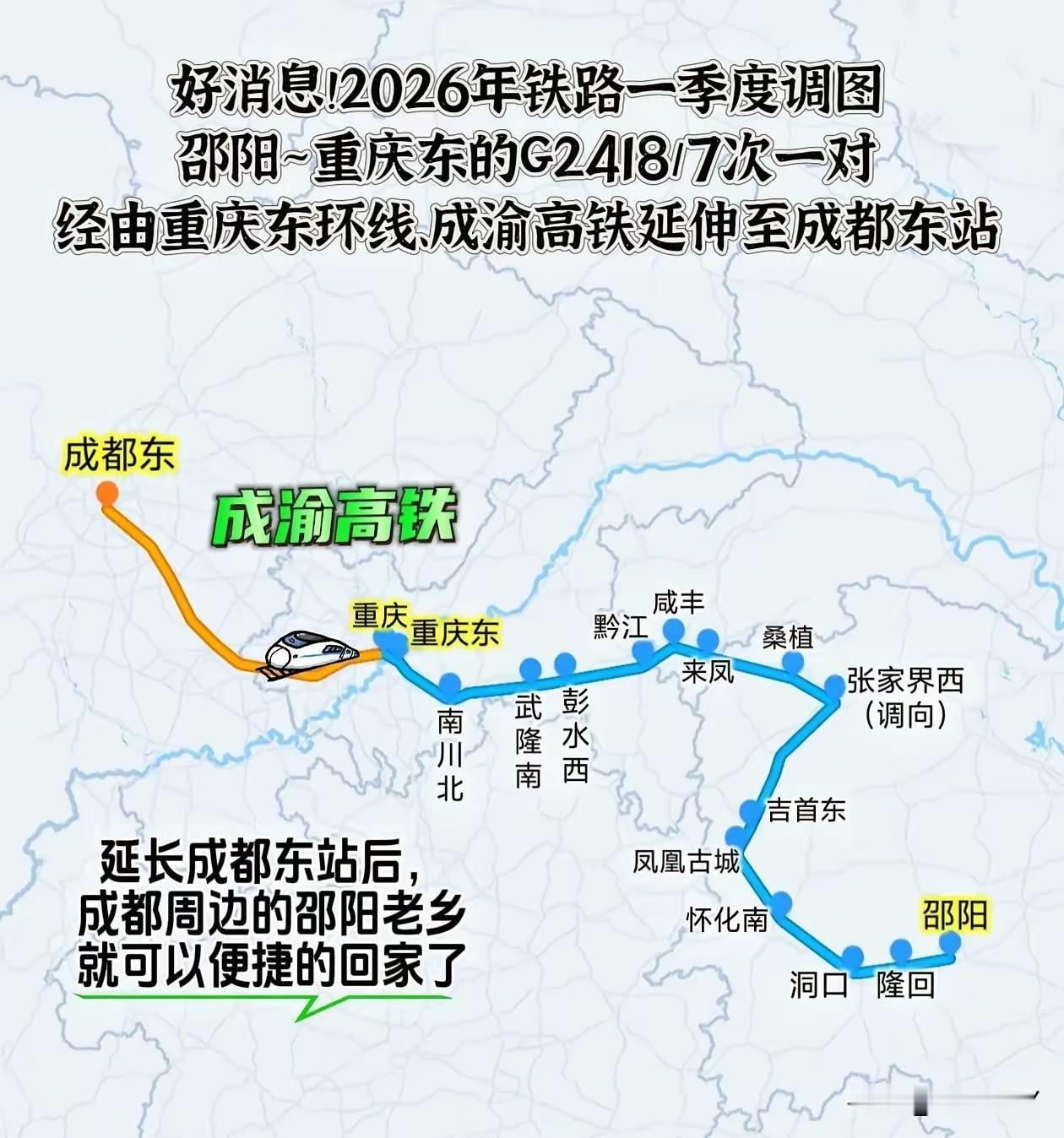 广铁集团开行的邵阳至重庆东G2417/G2418次要延长至成都东站啦!这真是天大的好消息,真为广铁集团点赞!希望成铁集团多学习,在2026年1月的调图中,增开一趟绵阳至邵阳的高铁,可以走同样的路线延长至绵阳始发,也可走贵州这边的路线。