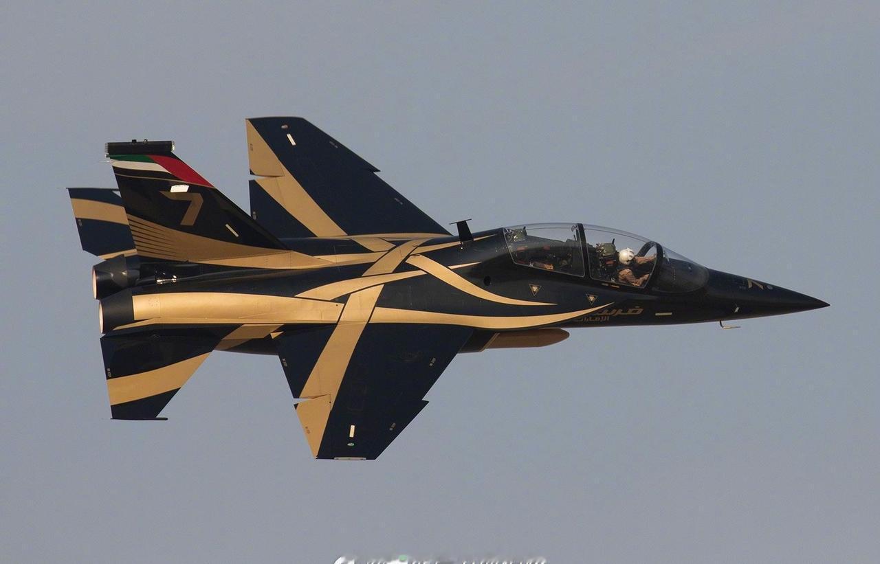 迪拜航线2025,阿联酋空军雄狮飞行表演队全面换装中国洪都产的L-15喷气式教练机,取代原来的MB-339,这个涂装真好看呀迪拜航展