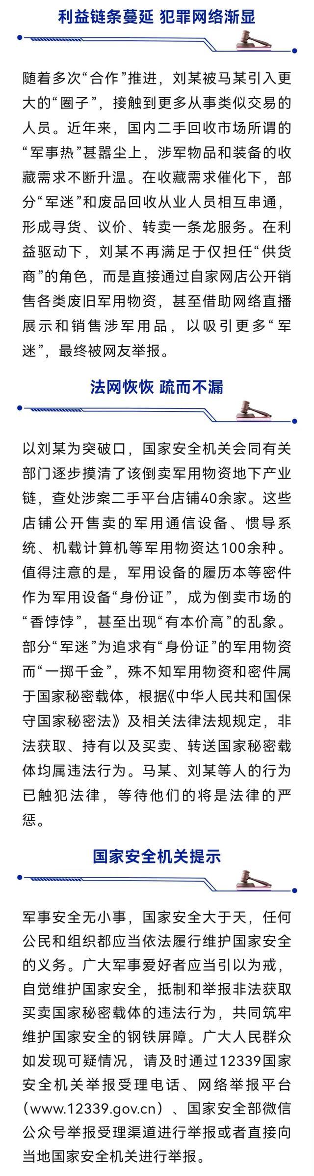 近期,国家安全机关接到12339举报受理电话称,有人利用网络二手平台从事涉军物品非法交易。
