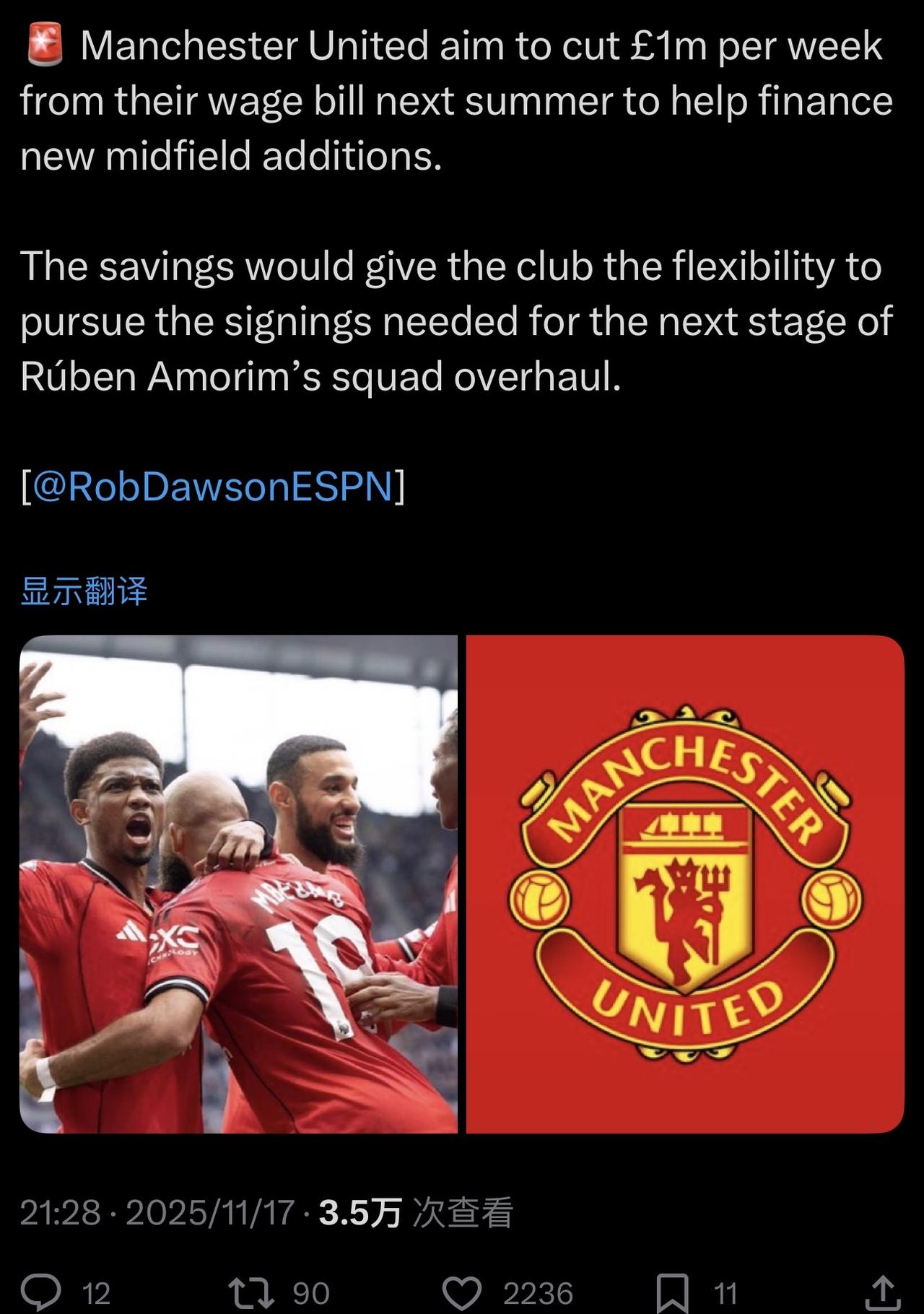 曼联计划在明年夏天每周削减 100 万英镑的工资支出,以帮助资助新引进的中场球员。 卡塞米罗30万,桑乔27万,拉什福德27万,奥纳纳18万。 如果B费再去中东,又是26万。 100万英镑是不是很简单[憨笑][憨笑][憨笑][憨笑] 节省下来的资金将使俱乐部有更大的灵活性,可以进行鲁本·阿莫林下一阶段球队重组所需的签约。
