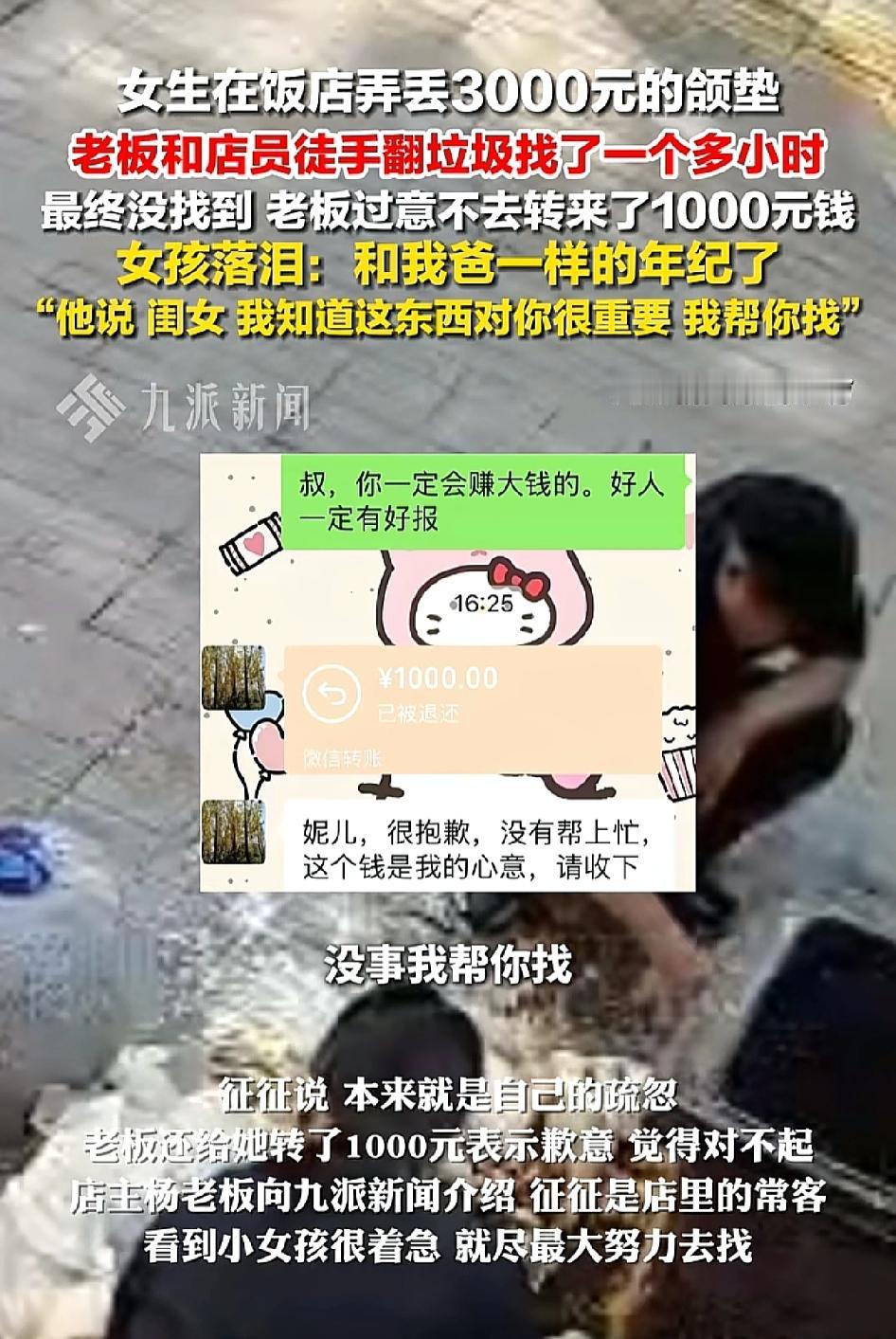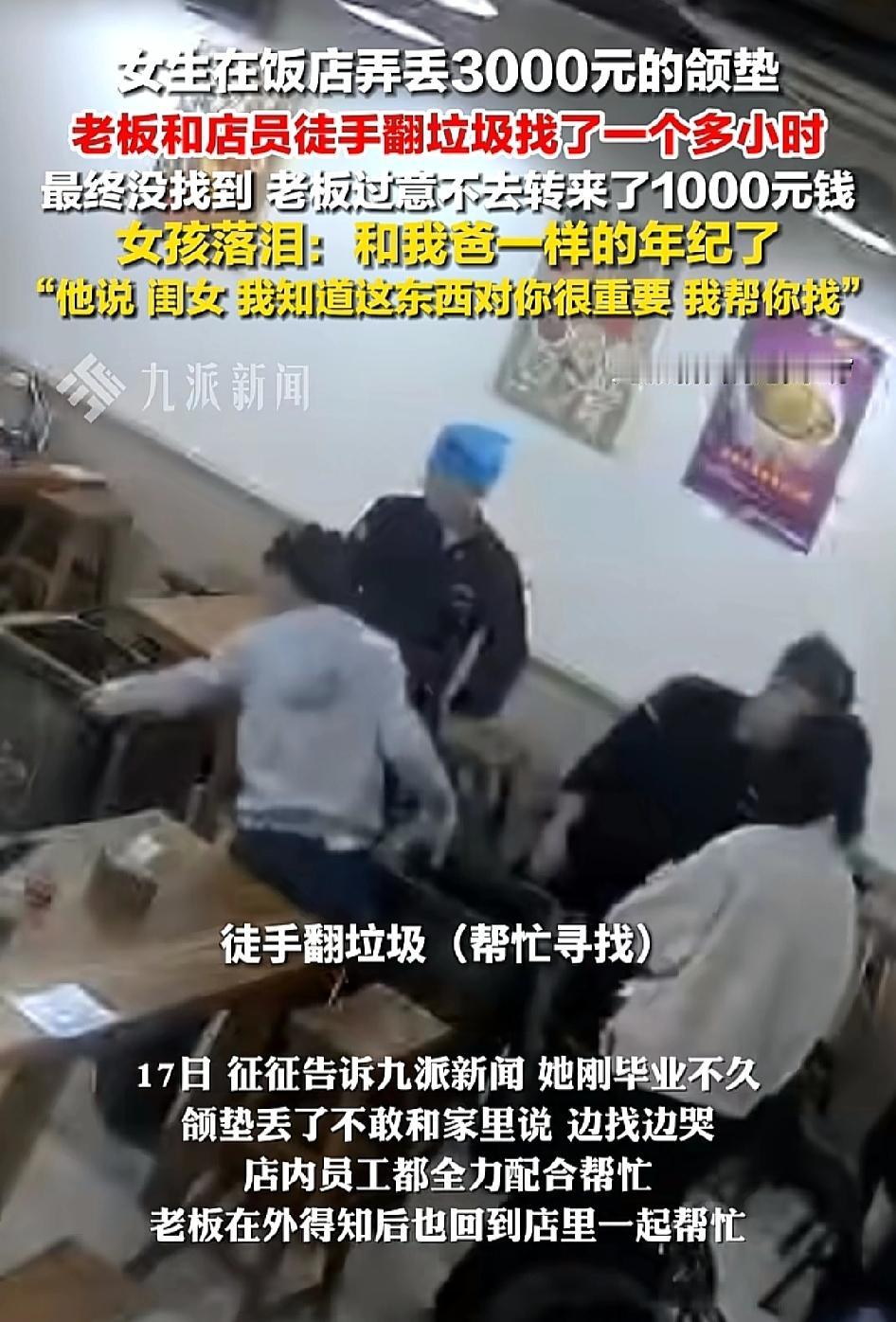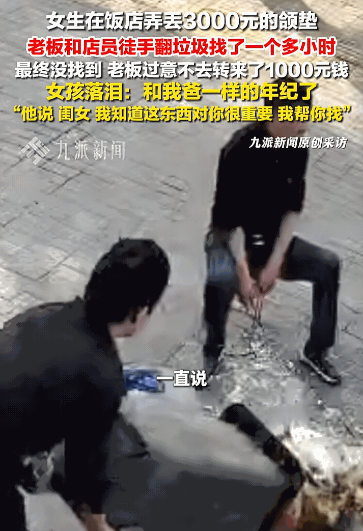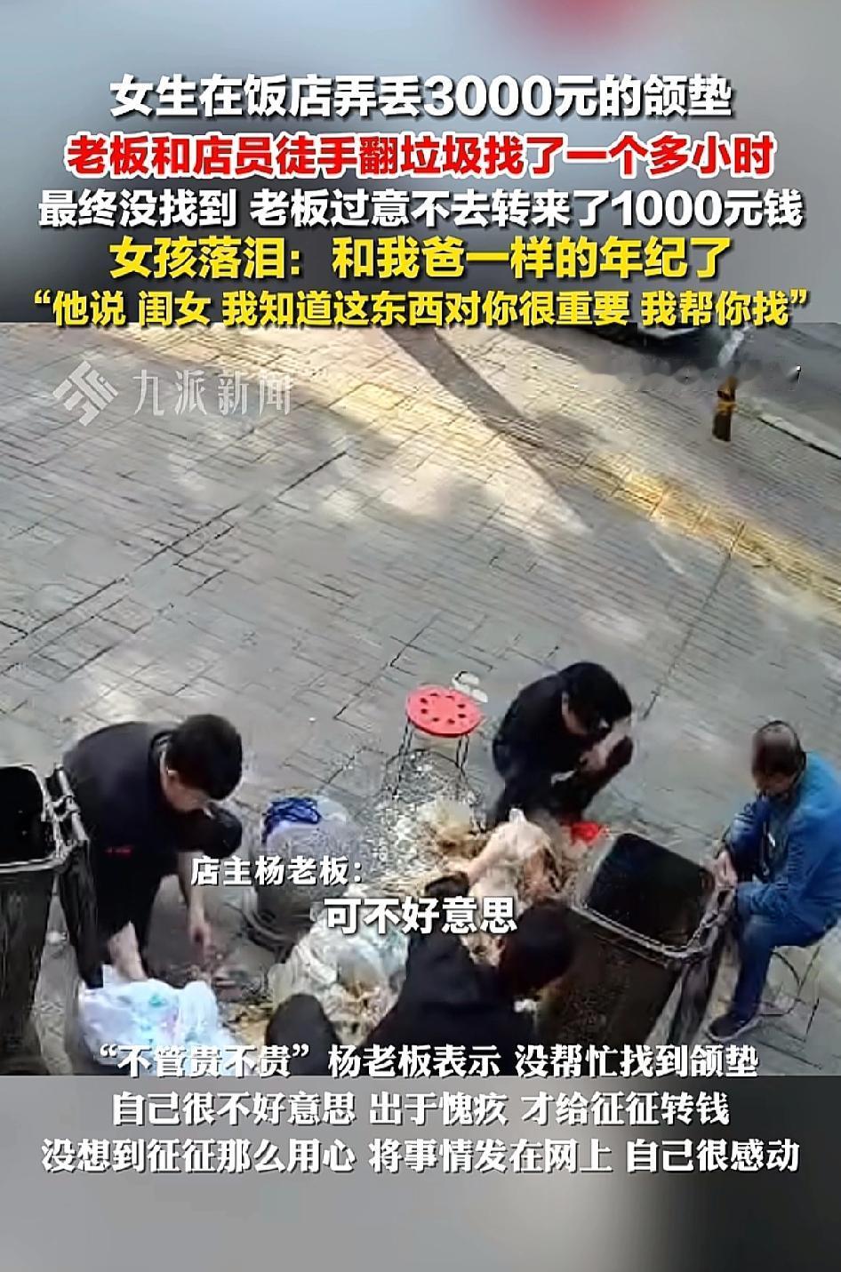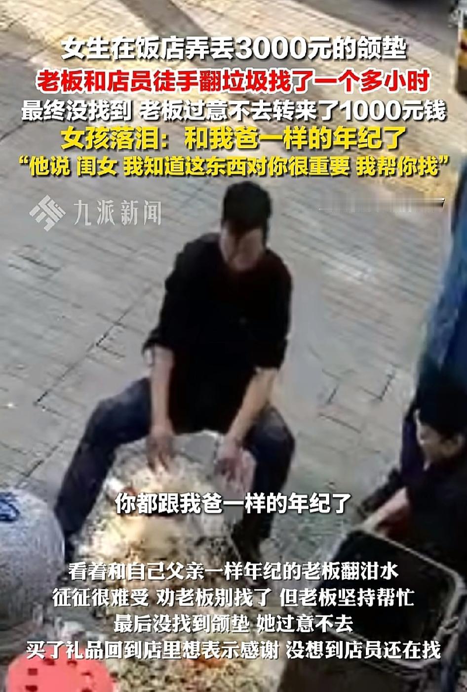 河南郑州,一女生在饭店吃饭时,结果不小心把价值3000元的颌垫弄丢了。老板和店员找了一个多小时没找到。老板过意不去,转给女生1000元钱,女孩感动落泪。 女生看到老板和店员徒手翻泔水桶找颌垫,感动不已,于是将此事发到了网上。 网友看到后议论纷纷,有网友说:“以前戴保持器也总是弄丢,吃完饭就和纸巾一起丢垃圾桶了,想起来的时候找也找不到了。” 随身物品一定要携带好,弄丢了就不好找回来了,还会很心疼。 冬日生活打卡季 (信息来源:九派新闻)